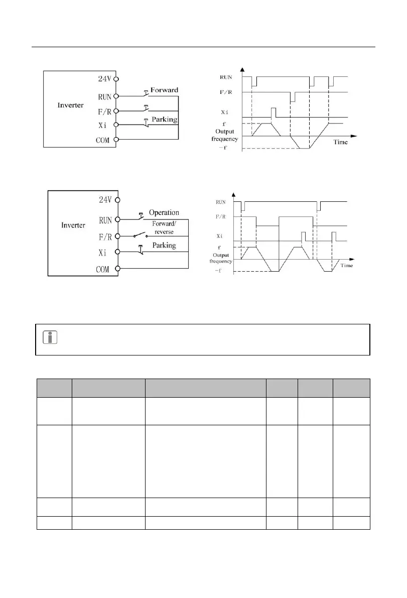 (c) Wiring diagram of two-line control (F00.03=3) (d) Forward/reverse running logic