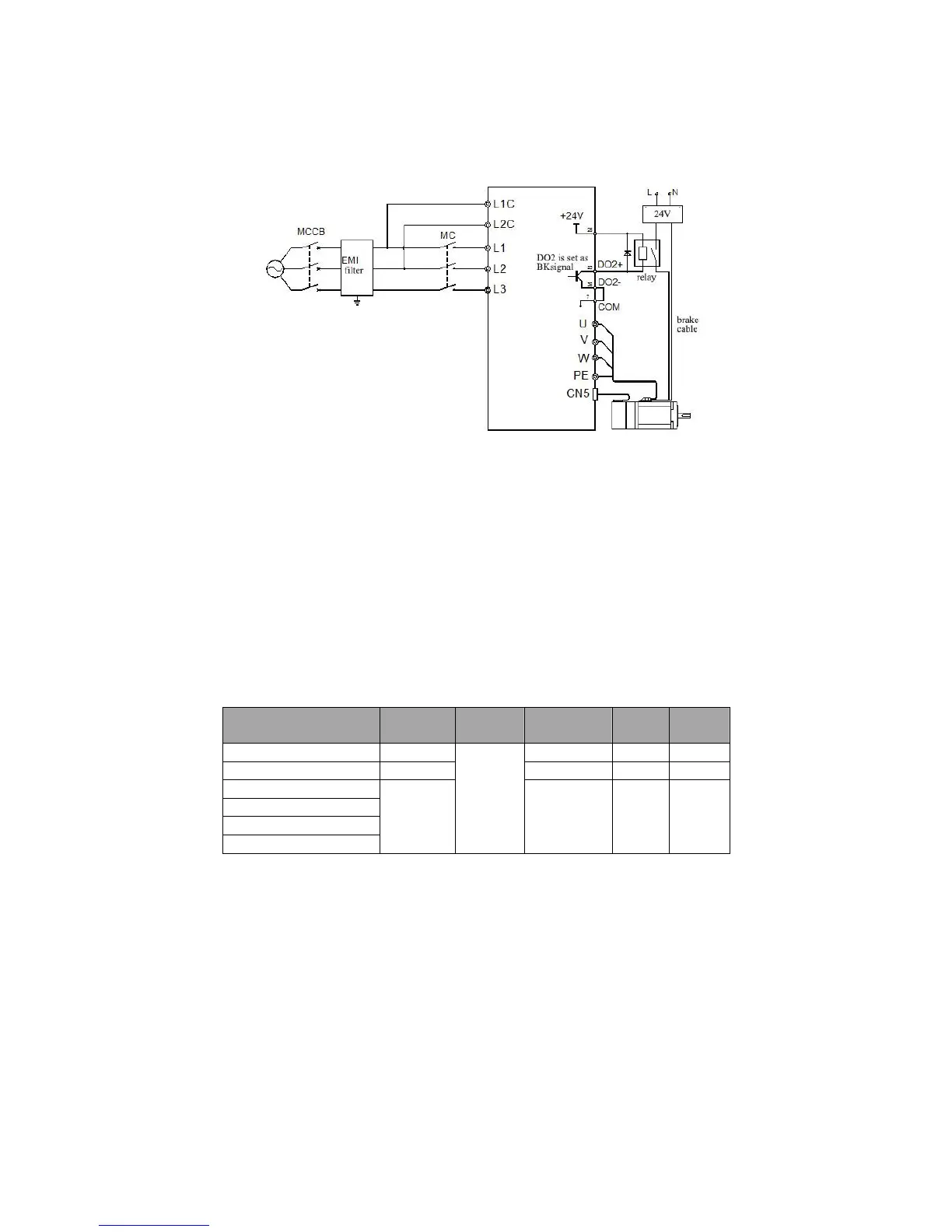 1) The 2nd function (BK) signal terminals (DO2 +, DO2-) should be used to control the intermediate relay. The power supply of brake is