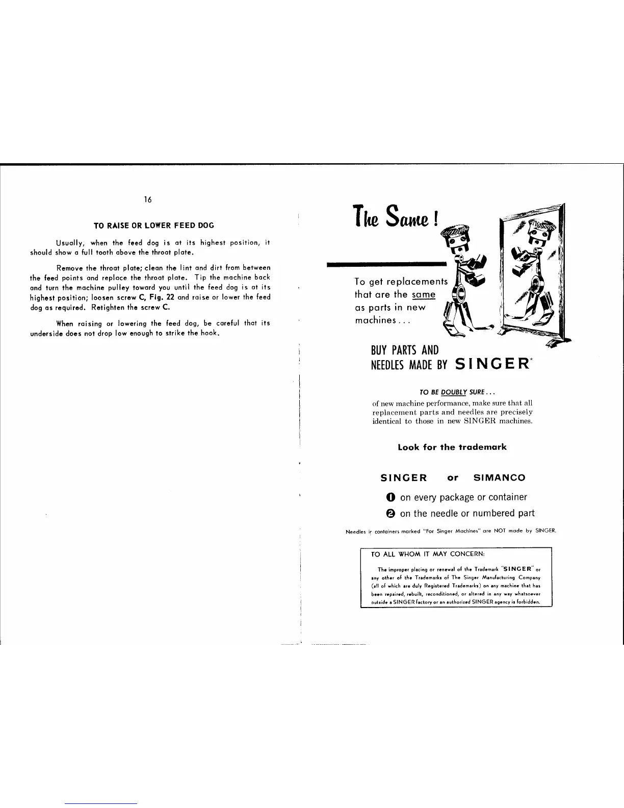 Singer 107G103 - Feed Dog Height Adjustment; Raising or Lowering Feed Dog; Singer Parts and Trademarks; Genuine Singer Parts