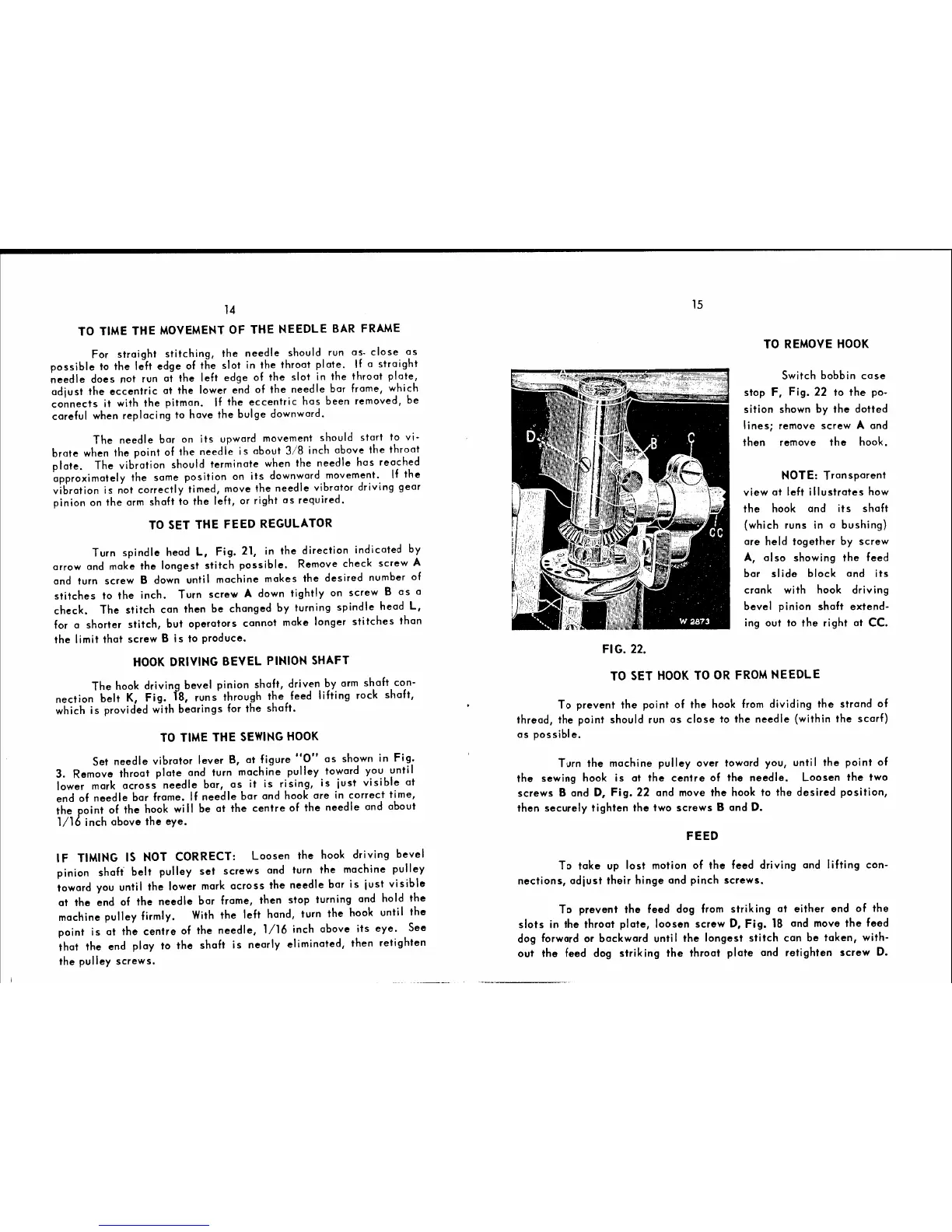 Singer 107G103 - Timing the Sewing Hook; Hook Removal and Setting; Removing the Hook; Setting Hook to Needle