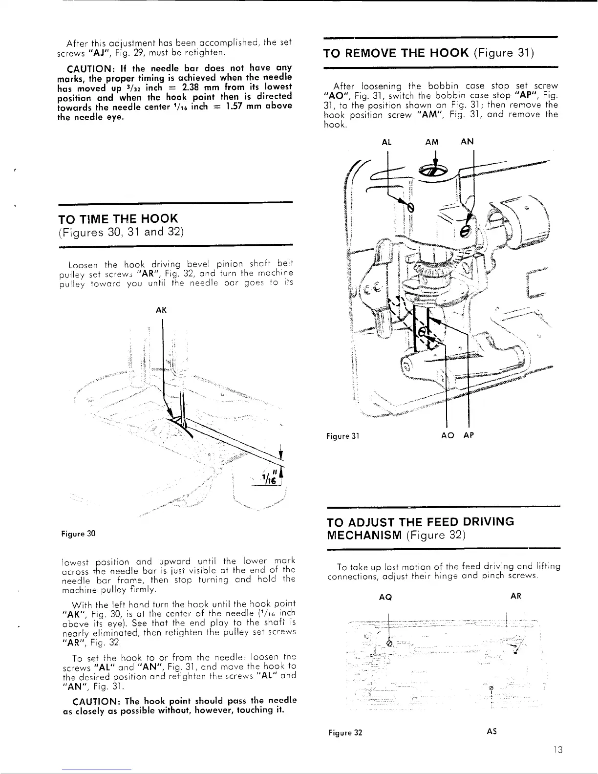 Singer 107G201 - Timing the Hook; Hook Driving Pulley Adjustment; Hook Point Alignment; Hook Timing Caution