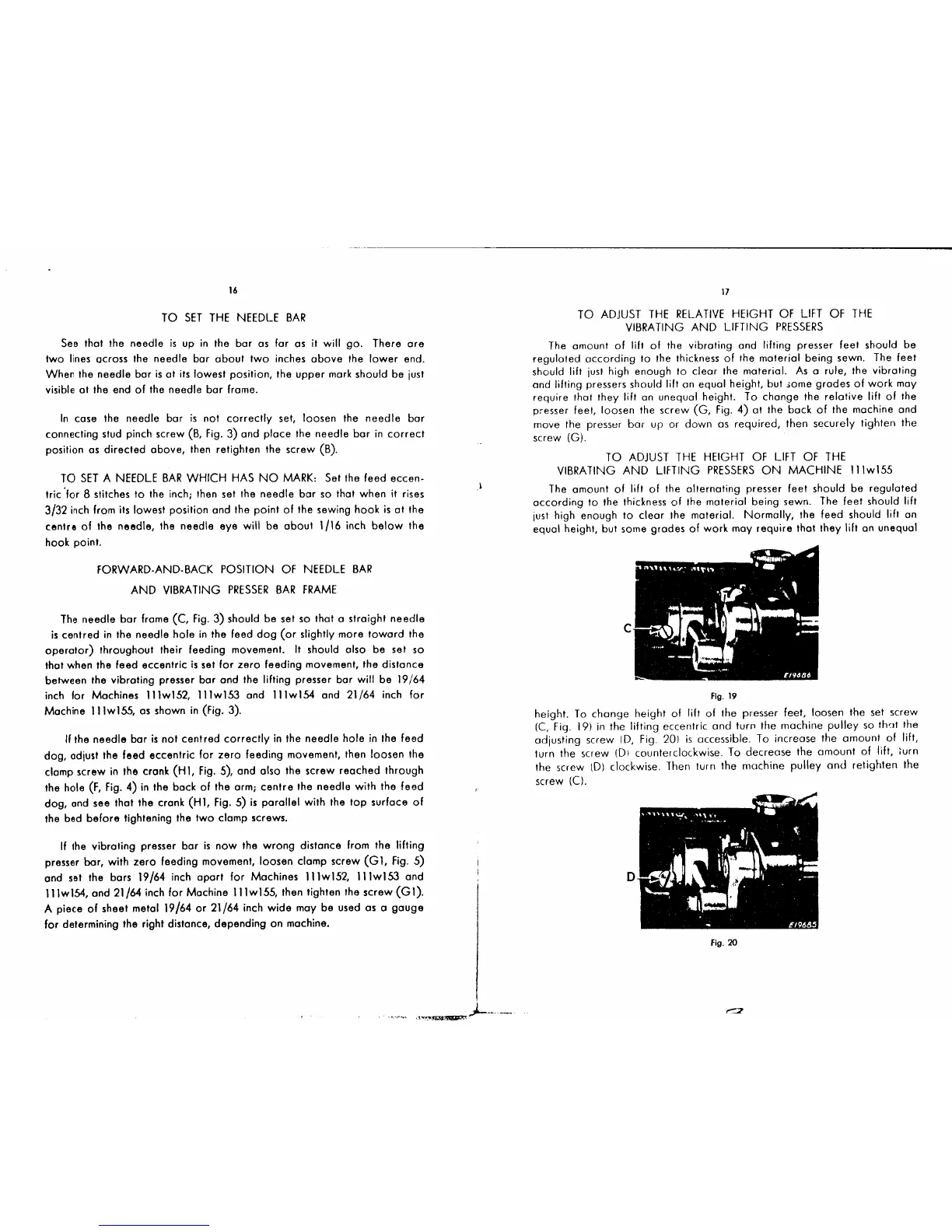 Singer 111W152 - To Set the Needle Bar; To Set a Needle Bar Which Has no Mark; Forward-And-Back Position of Needle Bar and Vibrating Presser Bar Frame; To Adjust the Relative Height of Lift of the Vibrating and Lifting Presser