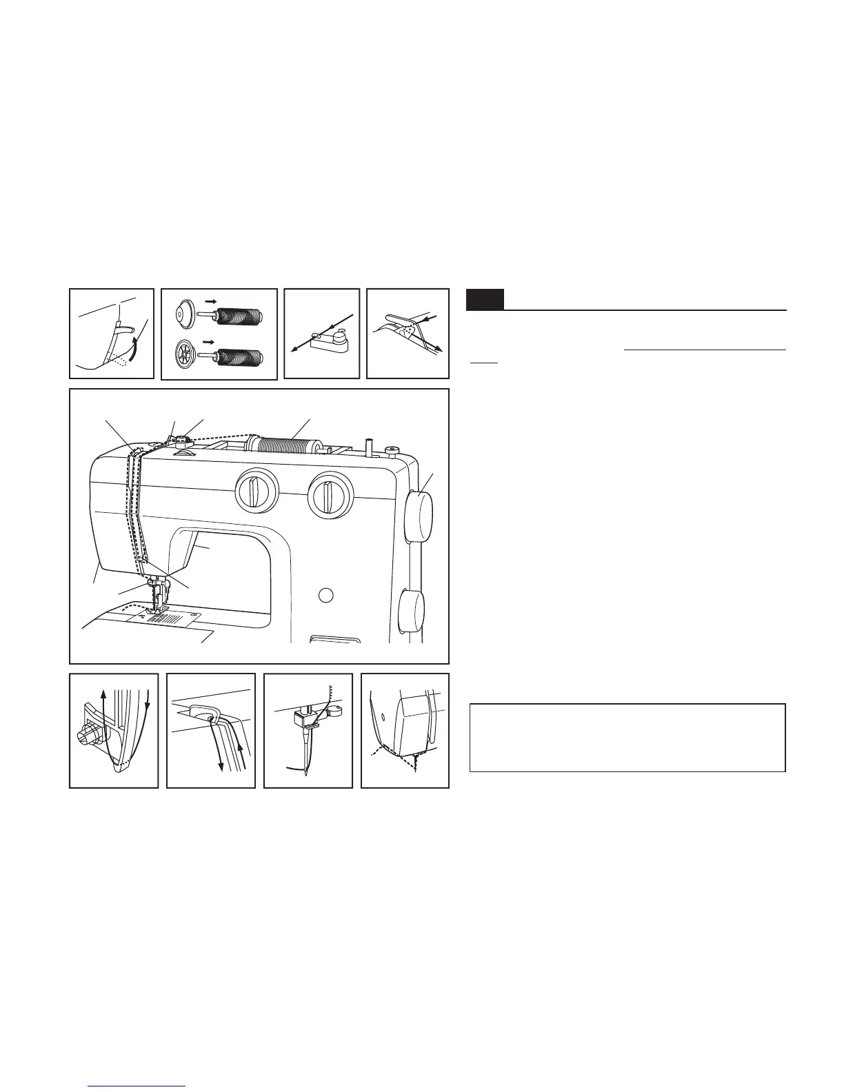 hold the thread between the spool and thread guide (4).