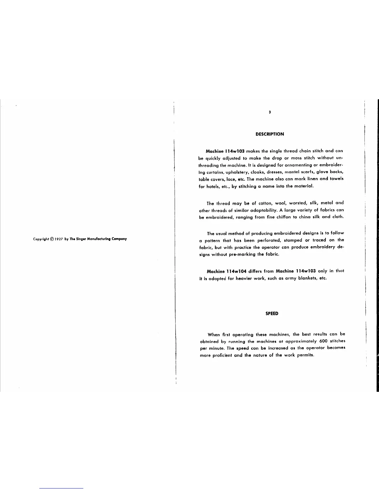 Singer 114W103 - MACHINE DESCRIPTION AND SPEED; Machine 114 w103; Machine 114 w104