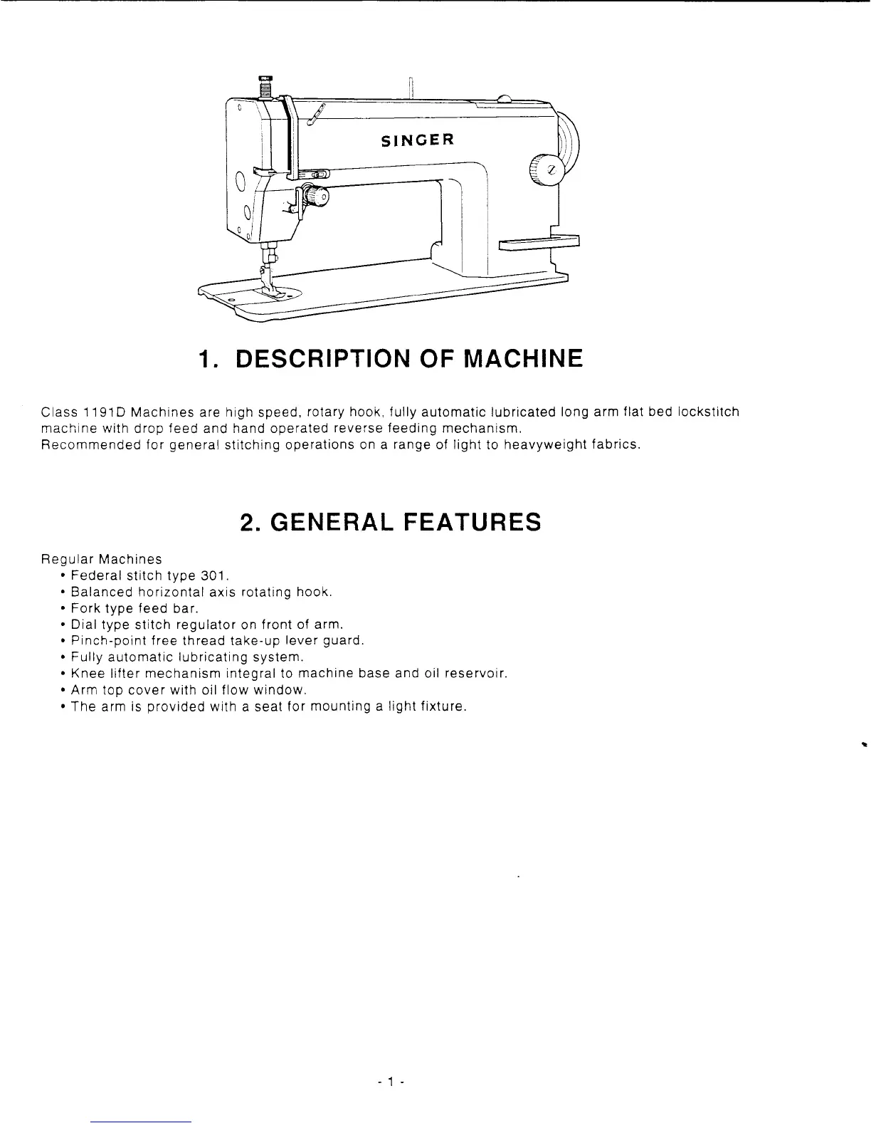 Singer 1191D300A - Description and General Features; Description of Machine; General Features
