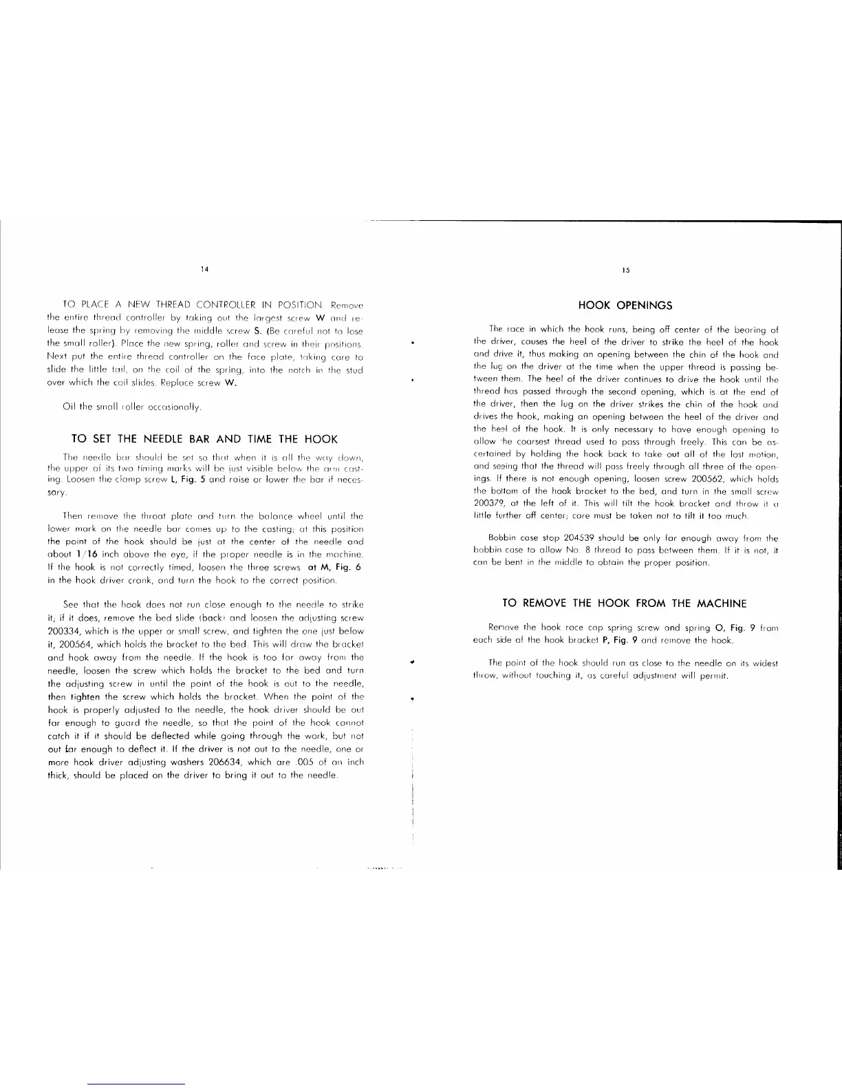 Singer 12W - Needle and Hook Adjustments; Setting Needle Bar and Timing Hook; Hook Openings and Timing Adjustments; Removing the Hook
