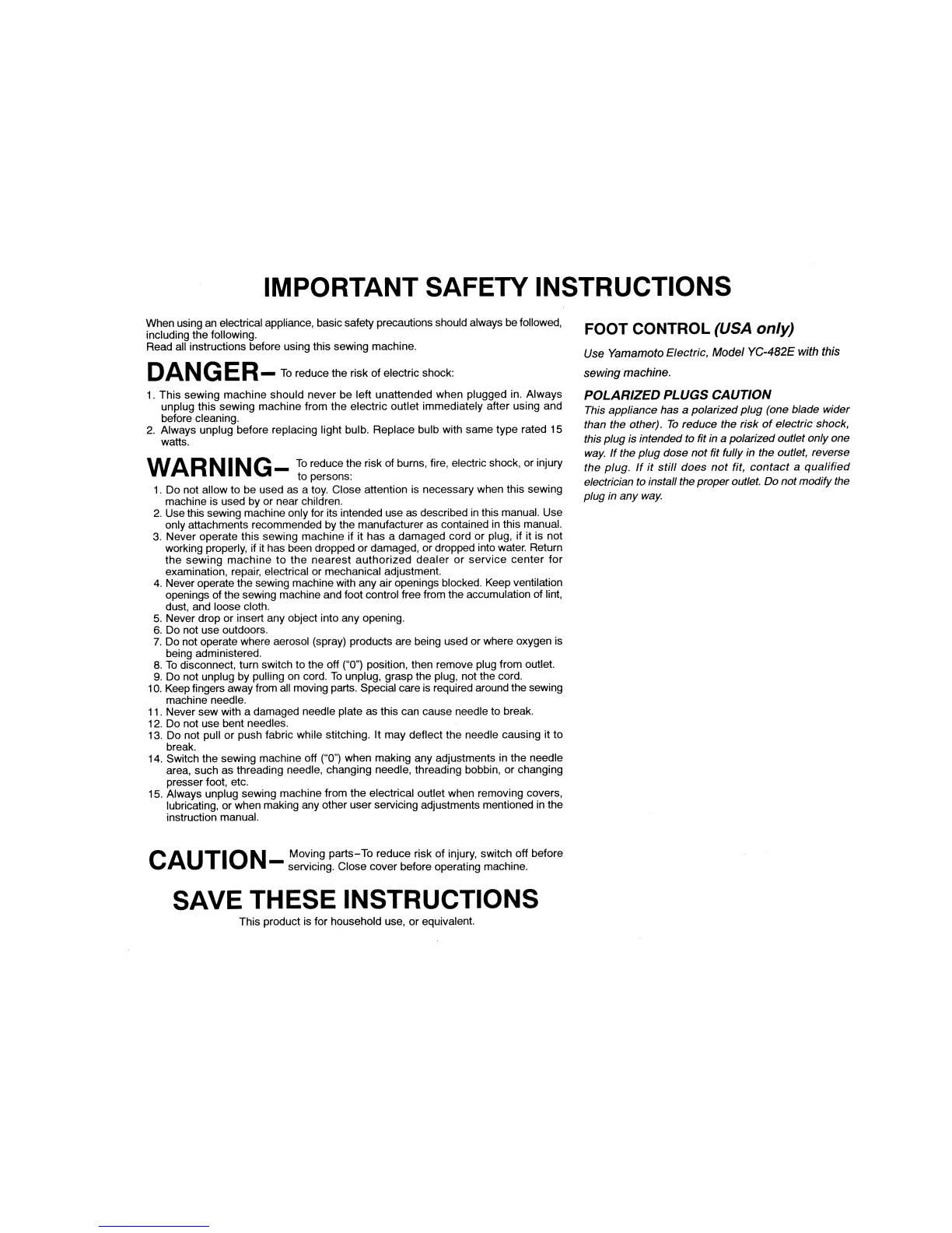Singer 132 Featherweight - Important Safety Instructions; Electrical Shock and Burn Prevention; Safe Operation and Handling; Foot Control and Plug Safety