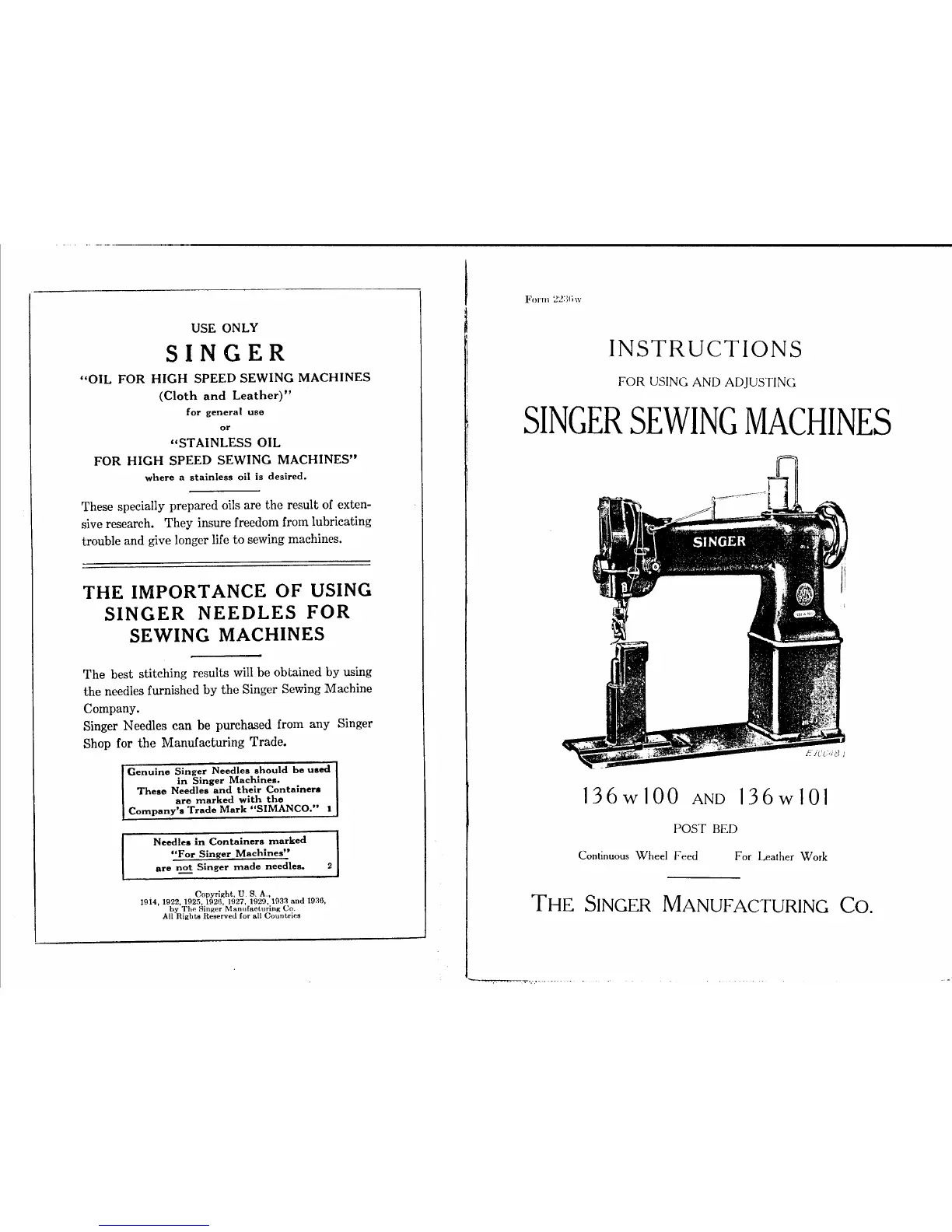 Singer 136W100 - Instructions for Using and Adjusting Singer Sewing Machines; Singer Oil Recommendations; Importance of Singer Needles
