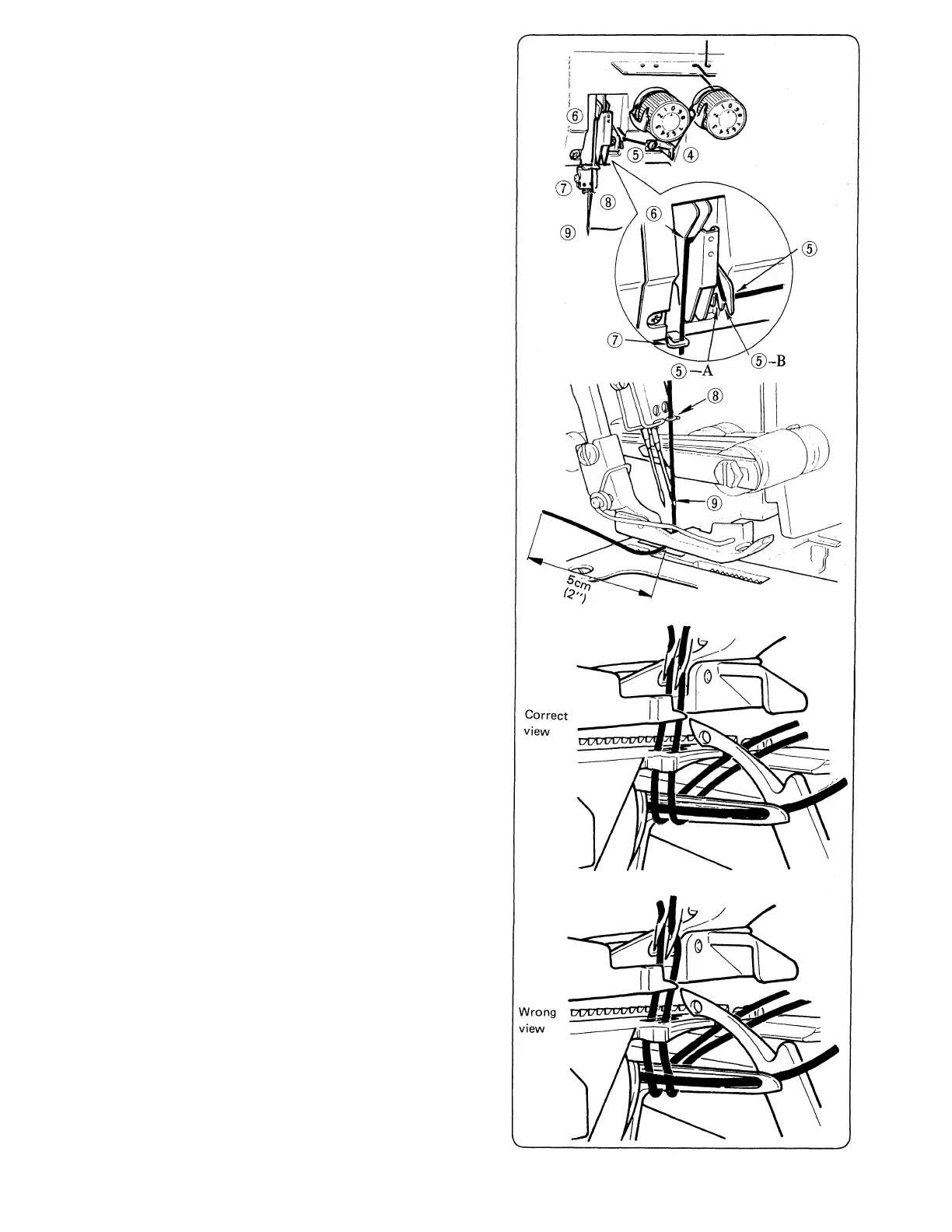 Note: Lower needle bar when threading (6) and ©•