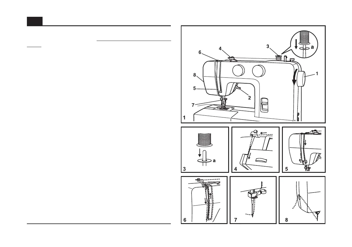 - Pull about 6-8 inches of thread to the rear beyond the needle