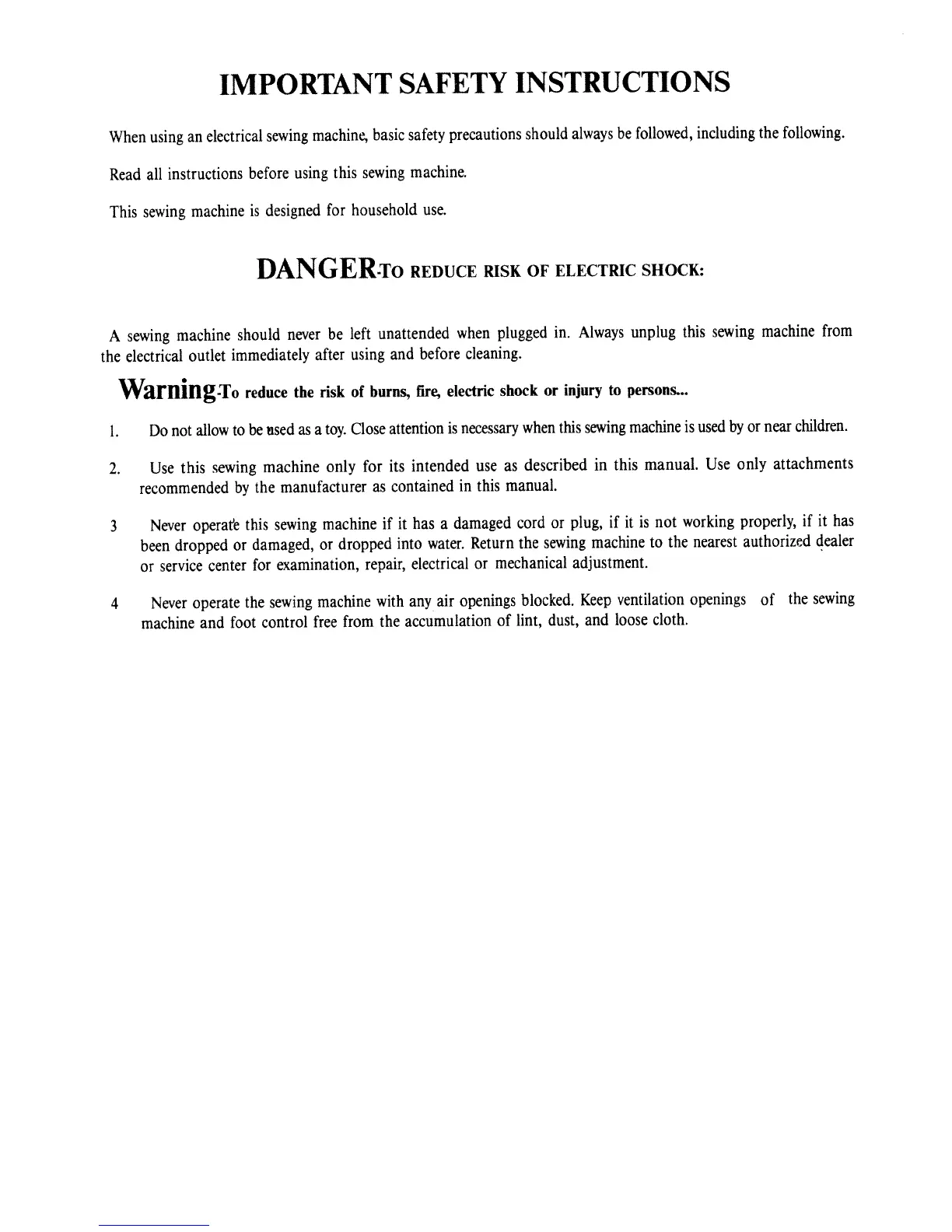 Singer 1411 - IMPORTANT SAFETY INSTRUCTIONS; Electrical Shock Prevention; General Usage Safety