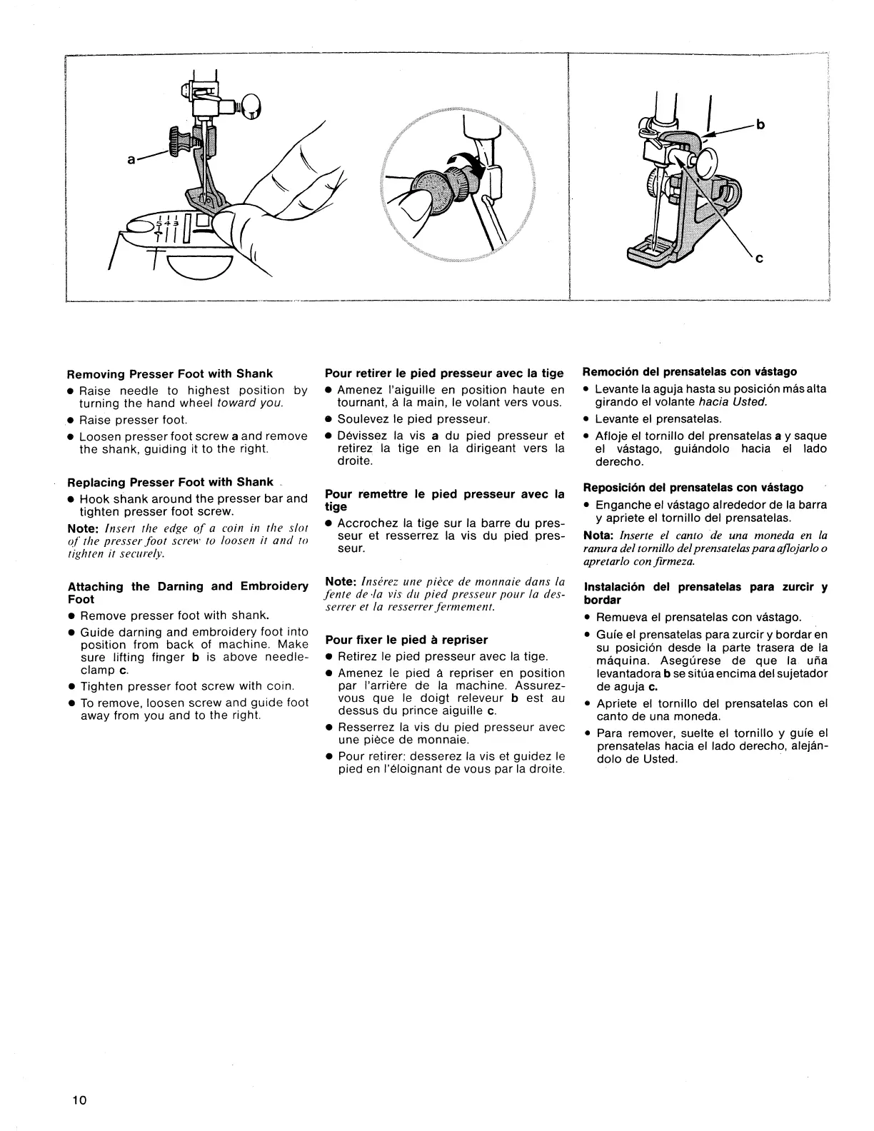 Singer 1425 - Removing Presser Foot with Shank; Replacing Presser Foot with Shank; Attaching the Darning and Embroidery Foot