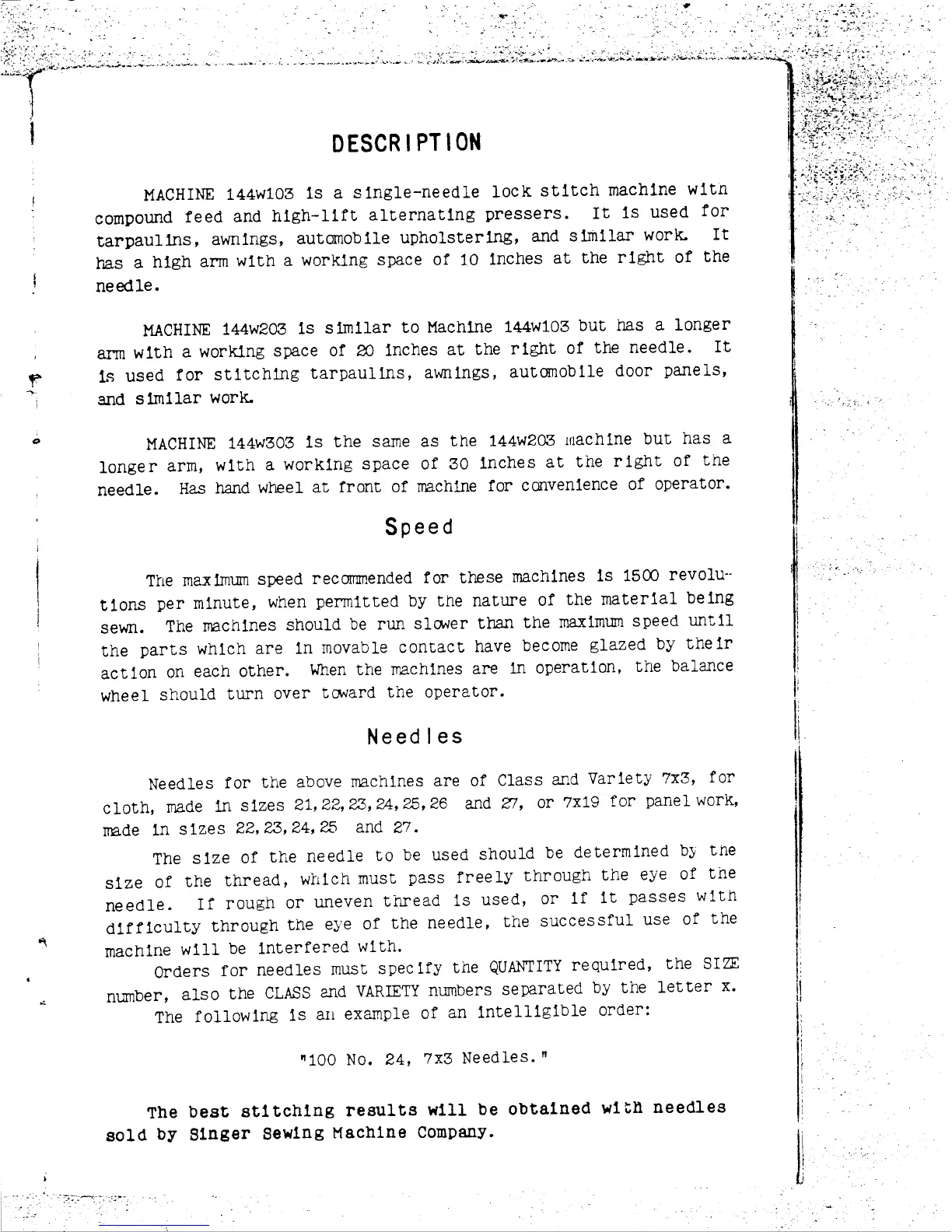 Singer 144W103 - Description; Speed; Needles