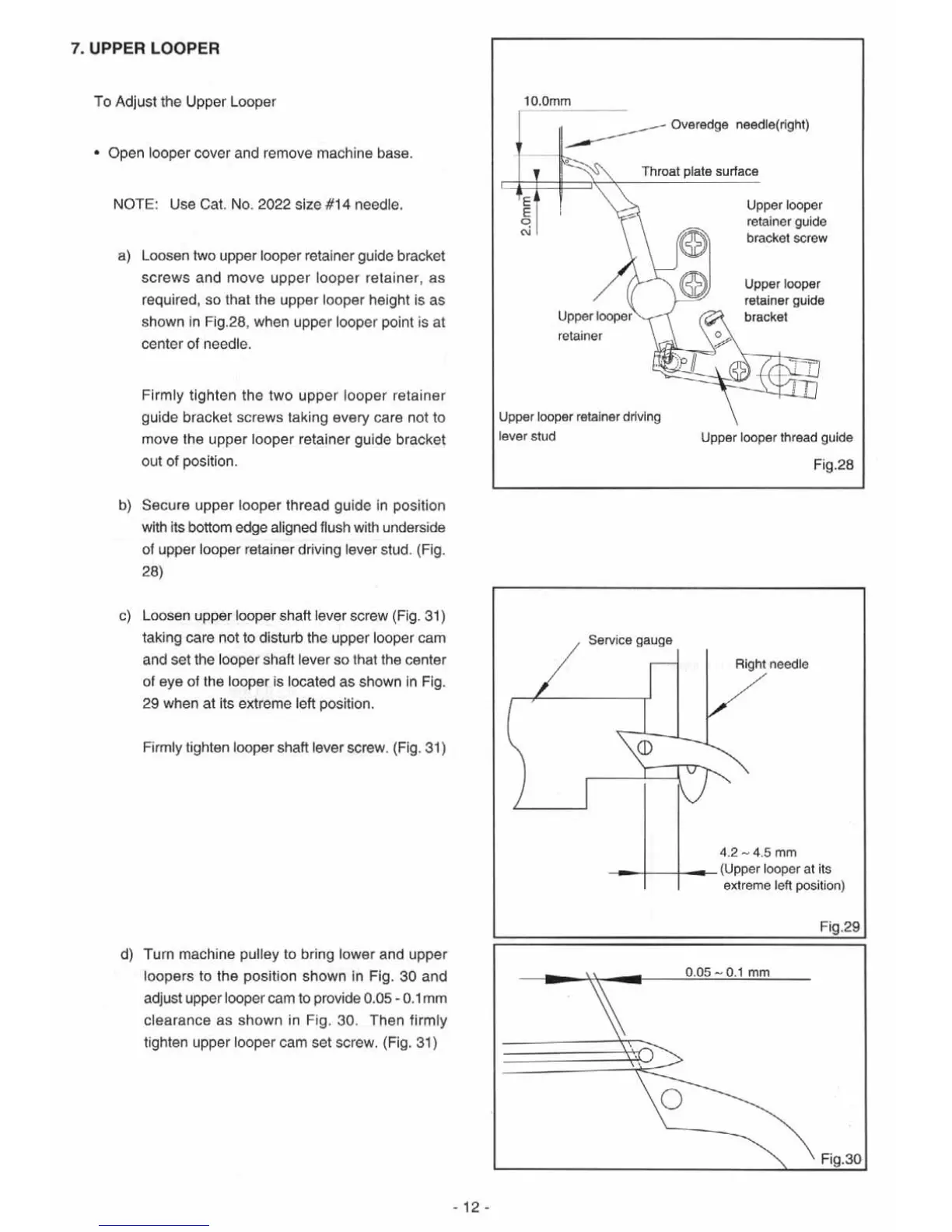 Singer 14SH 644 - Upper Looper Timing and Setting; Upper Looper Retainer Guide Adjustment; Upper Looper Shaft Lever Timing; Upper Looper Cam Timing