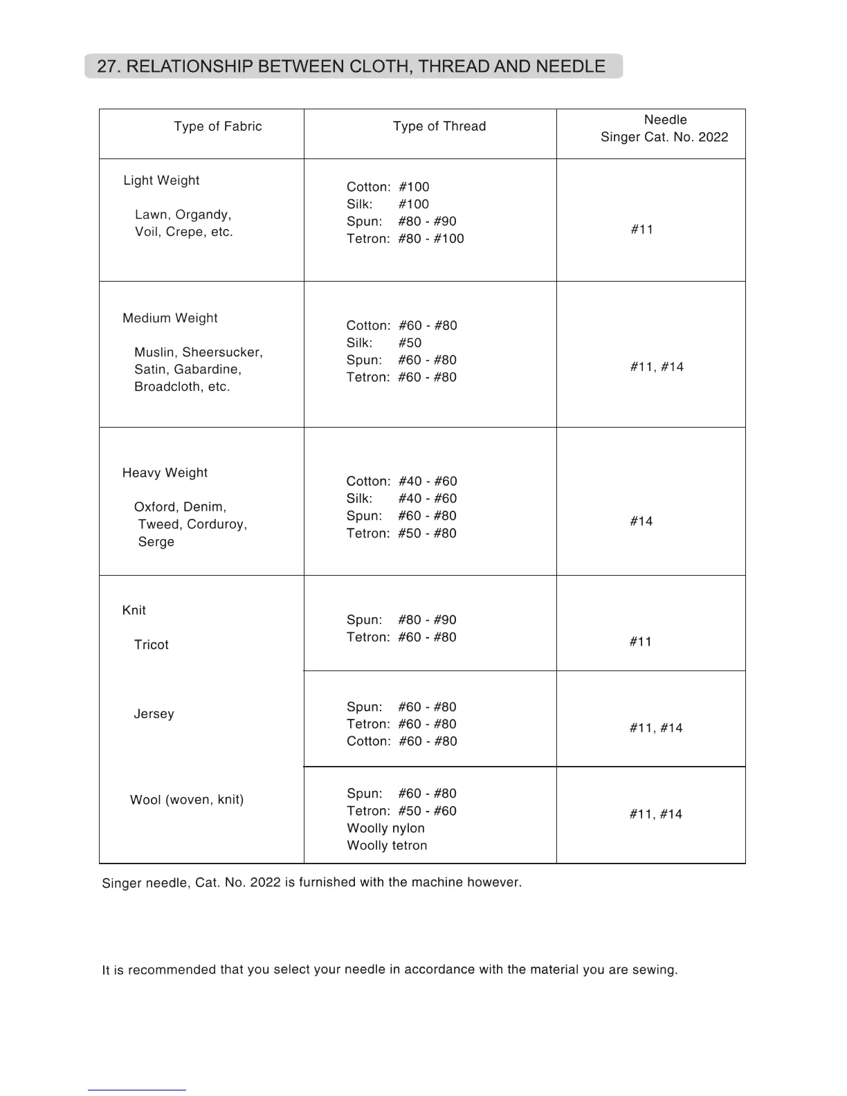 Singer 14SH764 - RELATIONSHIP BETWEEN CLOTH, THREAD AND NEEDLE