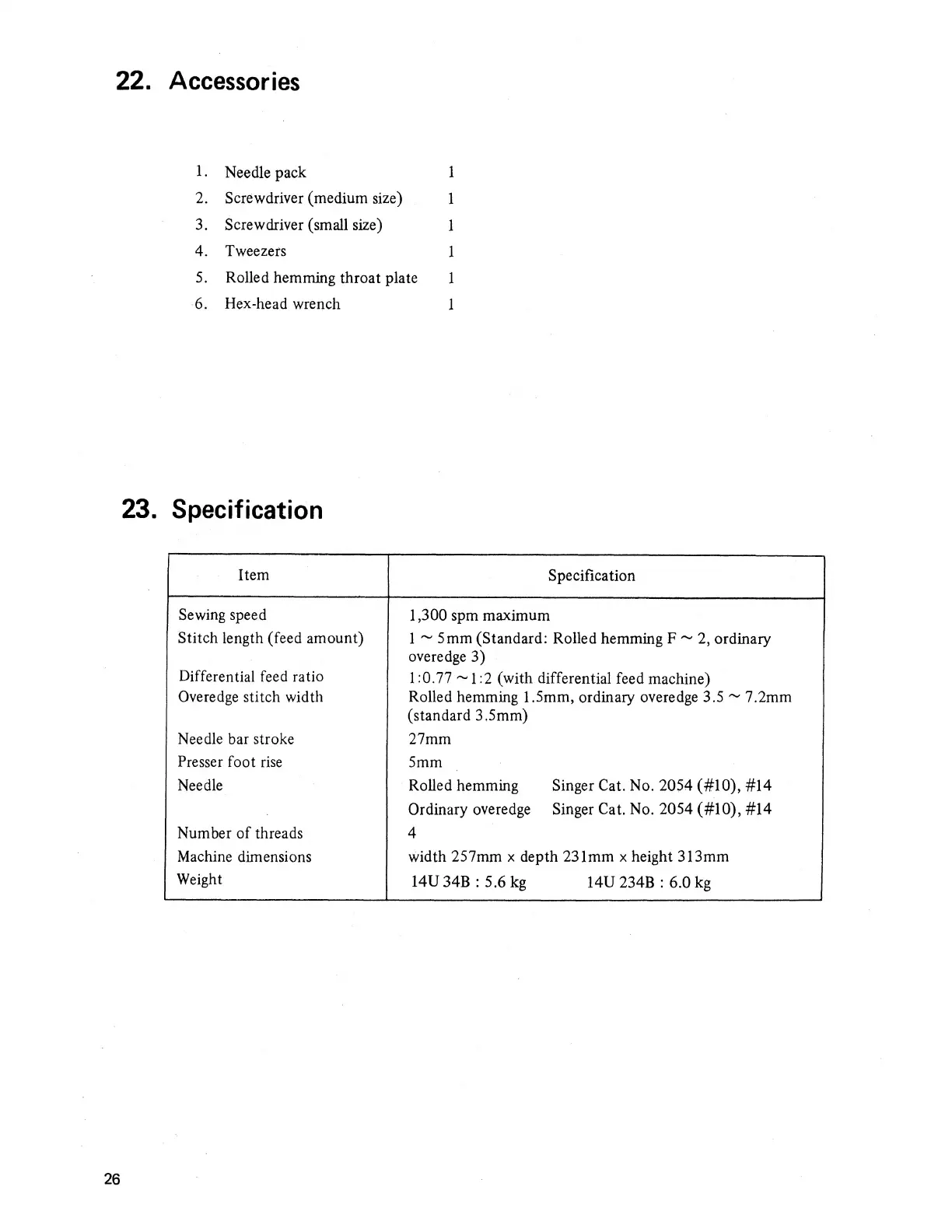 Singer 14U 34B - 22 Accessories; 23 Specification