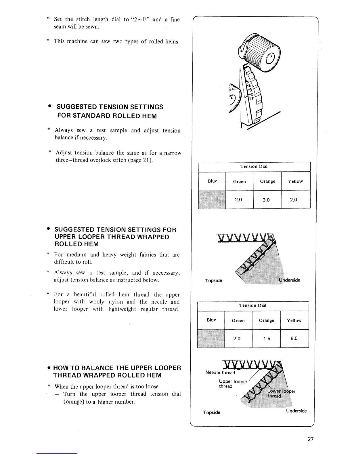 Singer 14U44B - Suggested Tension Settings for Standard Rolled Hem; Suggested Tension Settings for Upper Looper Thread Wrapped Rolled Hem; How to Balance the Upper Looper Thread Wrapped Rolled Hem