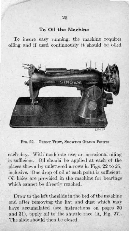 and 31), apply oil to the shuttle race (A, Fig. 27).