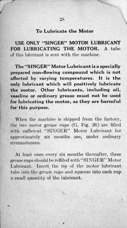 USE ONLY "SINGER" MOTOR LUBRICANT