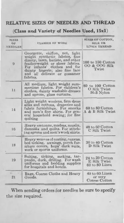RELATIVE SIZES OF NEEDLES AND THREAD