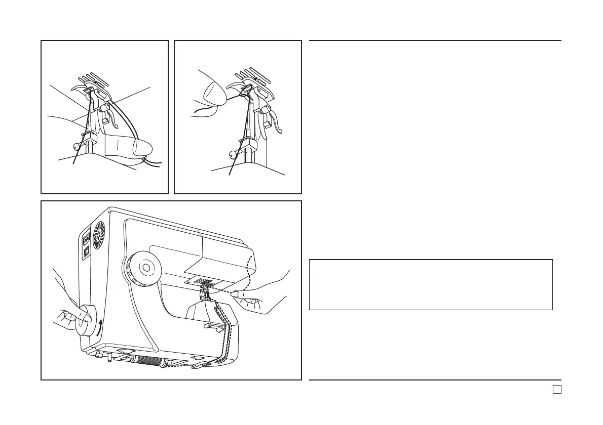 Pegang benang atas dengan tangan kiri. Putar roda tangan (1)