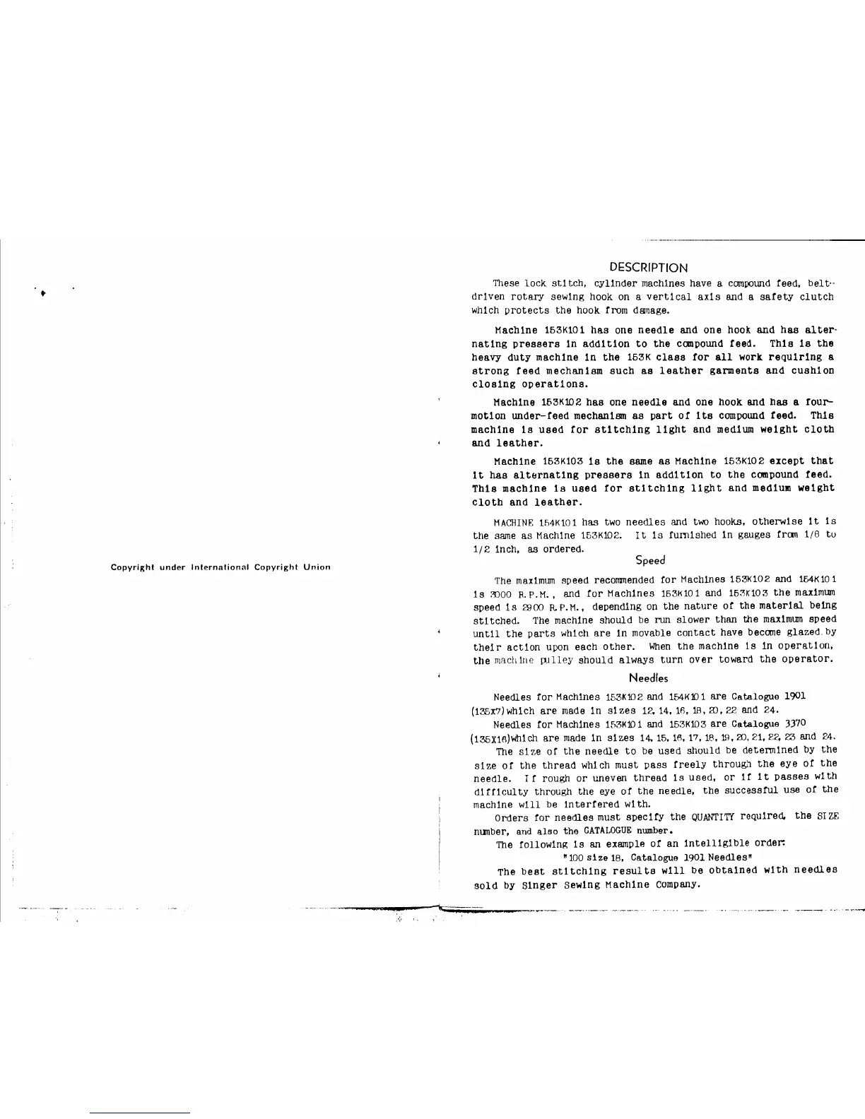 Singer 153W102 - Machine Descriptions and Specifications; 153 K101 Heavy Duty Machine; 153 K102 and 153 K103 Models; 154 K101 Two-Needle Machine