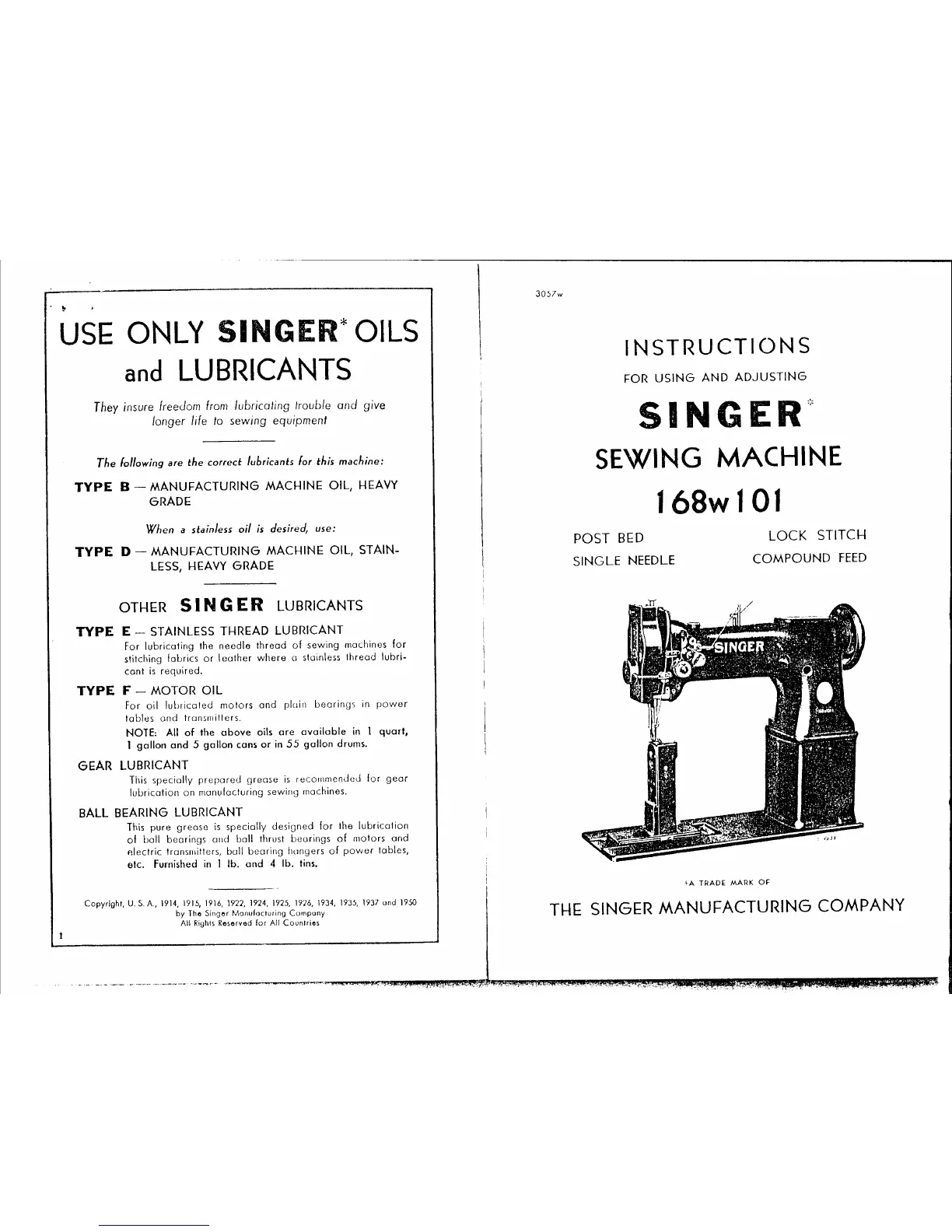 Singer 168W101 - Singer Lubricant Recommendations; Type B Manufacturing Machine Oil; Type D Stainless Machine Oil; Type E Stainless Thread Lubricant