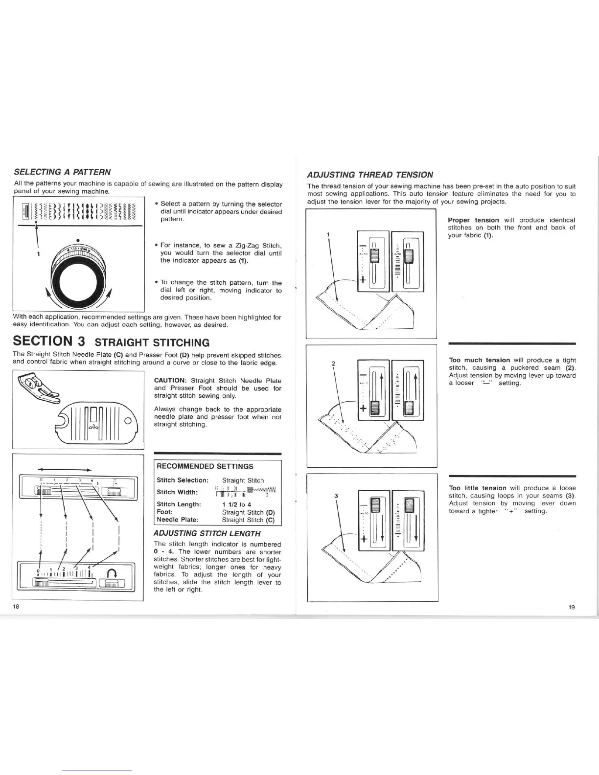 Singer 17 PATTERN SEWING MACHINE - Straight Stitching; Selecting a Pattern; Adjusting Thread Tension; Adjusting Stitch Length