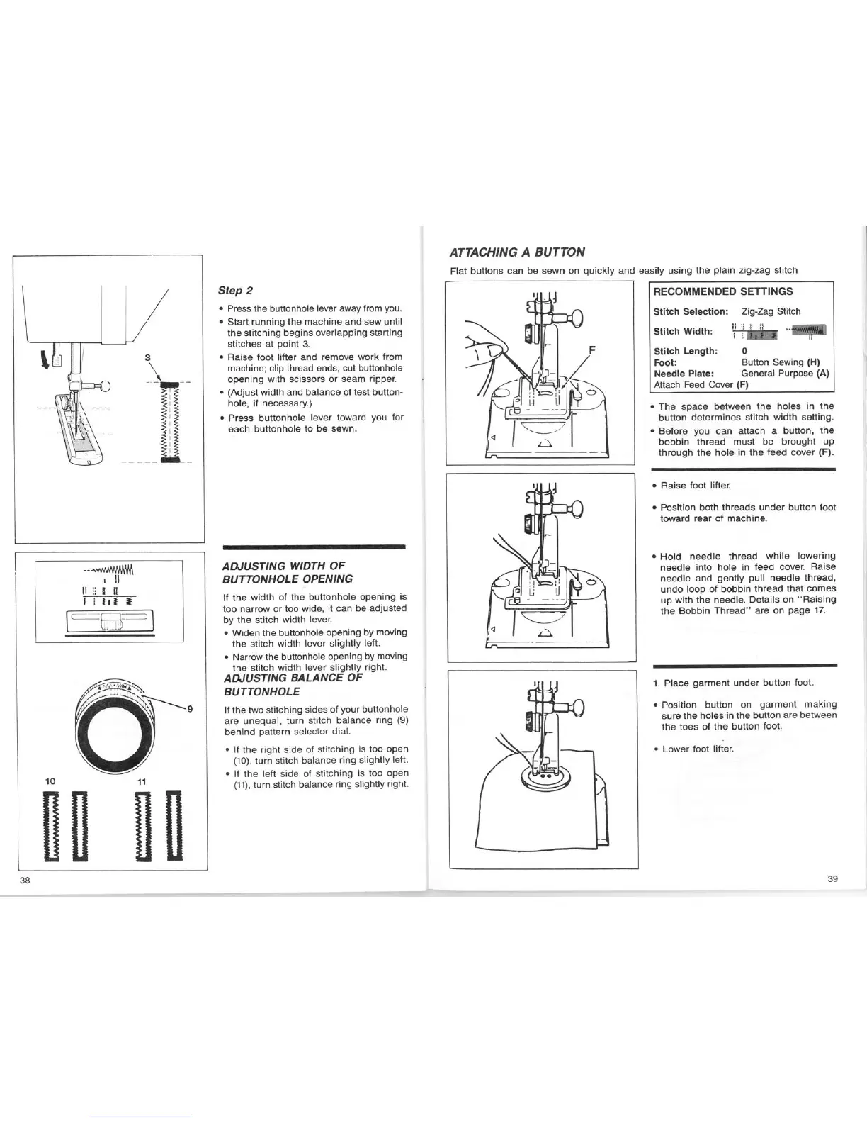 Singer 17 PATTERN SEWING MACHINE - Attaching a Button; Adjusting Width of Buttonhole Opening; Adjusting Balance of Buttonhole