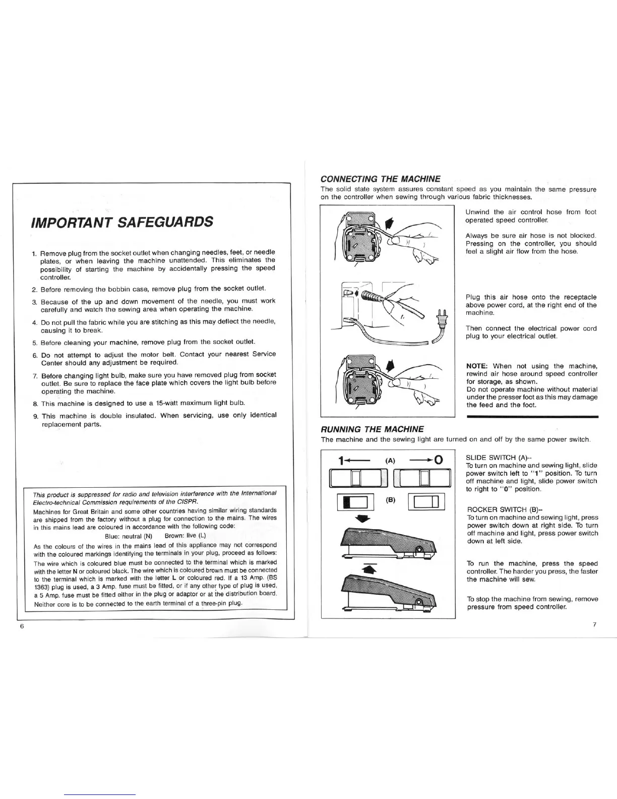 Singer 17 PATTERN SEWING MACHINE - Important Safeguards; Connecting the Machine; Running the Machine
