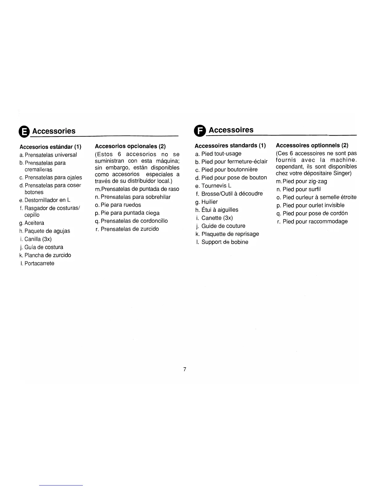 Singer 1725 - Sewing Machine Accessories; Standard Included Accessories; Optional Accessories List