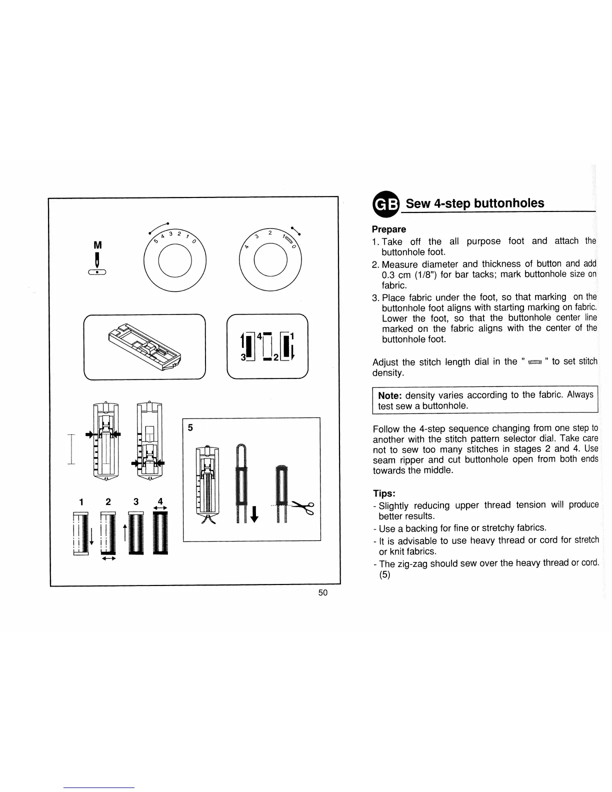 Singer 1725 - Sewing 4-Step Buttonholes; Buttonhole Preparation and Sewing Steps; Tips for Sewing Buttonholes