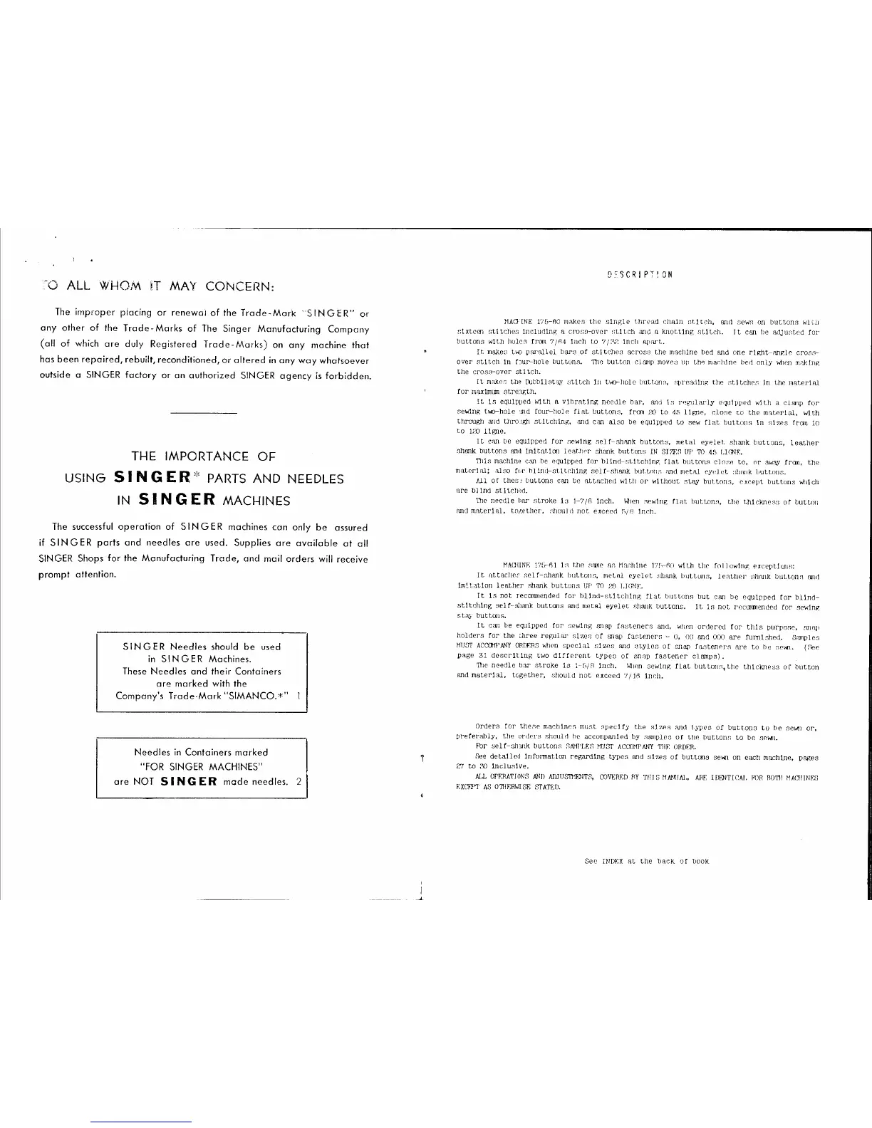 Singer 175-60 - Machine Description; Importance of Singer Parts and Needles; Machine 175-60 Features; Machine 175-61 Exceptions