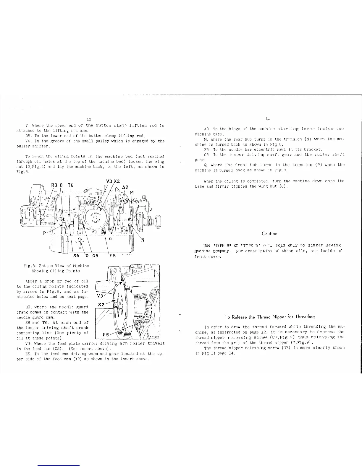 Singer 175-60 - Machine Oiling Procedures (Continued); Bottom View Oiling Points; Oil Type Caution; Releasing Thread Nipper for Threading