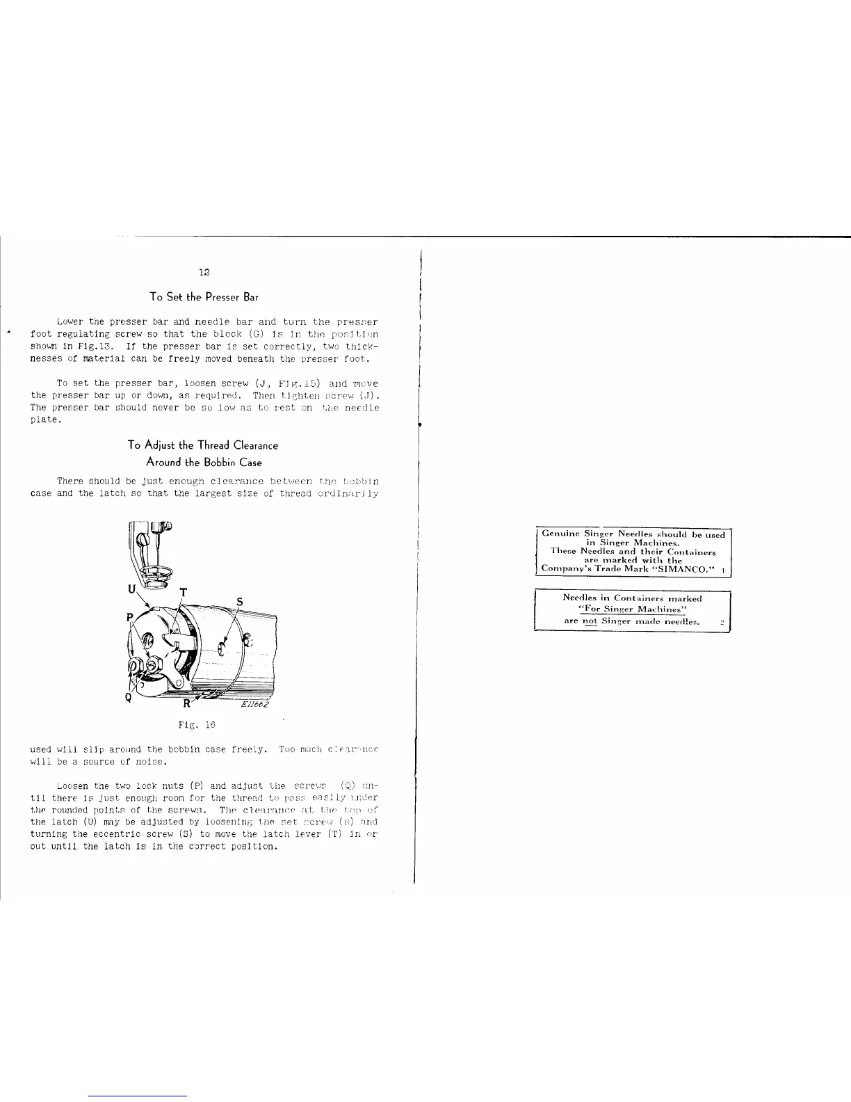 Singer 177-2 - Machine Adjustments; Setting the Presser Bar; Adjusting Thread Clearance