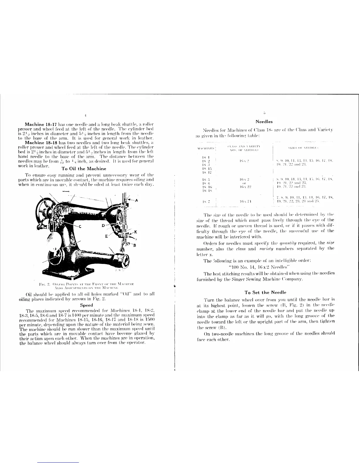 Singer 18 - Machine Oiling, Speed, and Needle Setup; Machine Oiling Guide; Recommended Machine Speed; Needle Selection and Setting Procedure