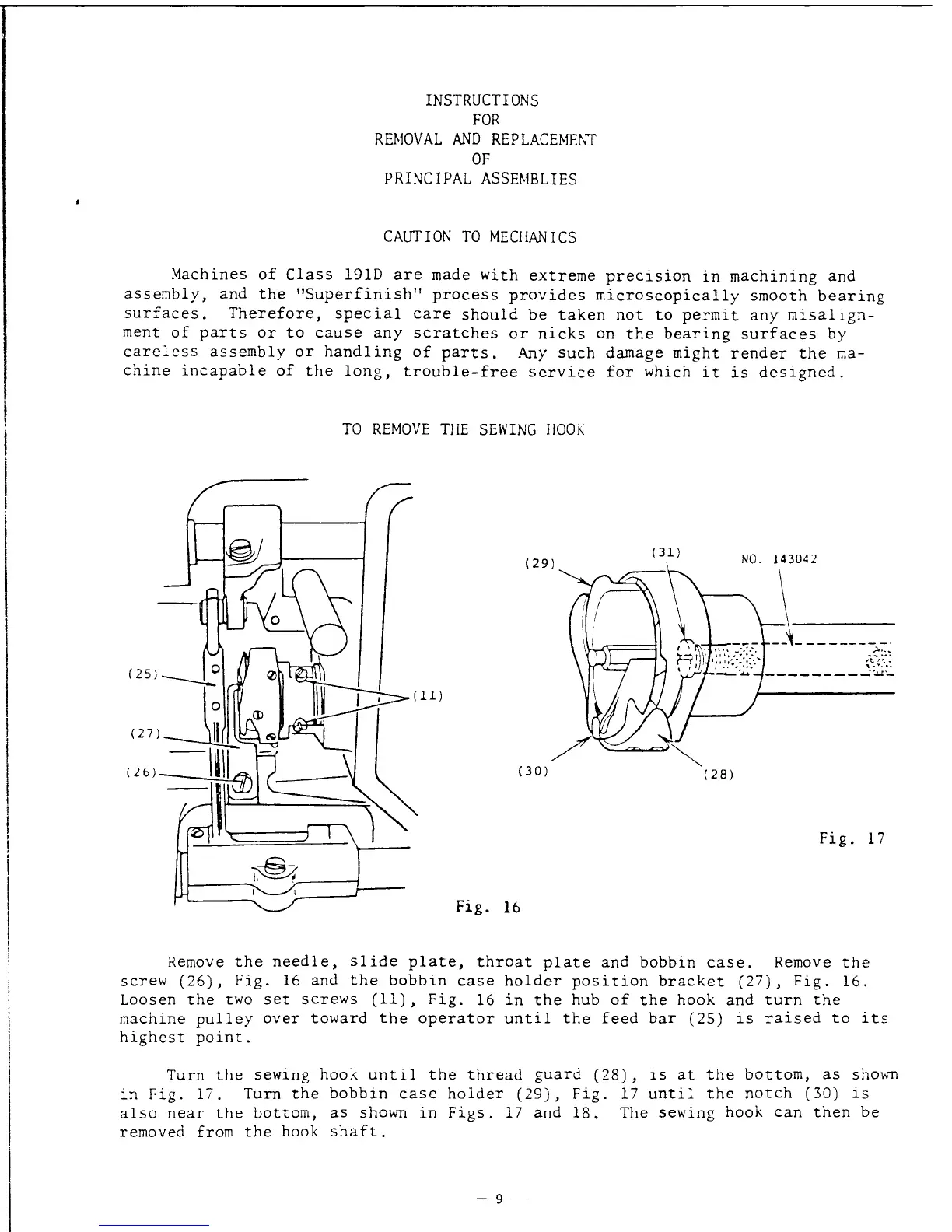 Singer 191D - Instructions for Removal and Replacement of Principal Assemblies; Caution to Mechanics; To Remove the Sewing Hook