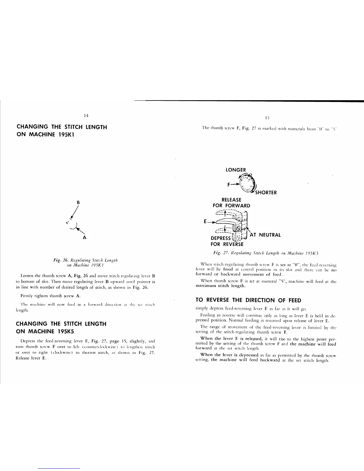 Singer 195K - Changing the Stitch Length on Machine 195 K1; Changing the Stitch Length on Machine 195 K5; To Reverse the Direction of Feed