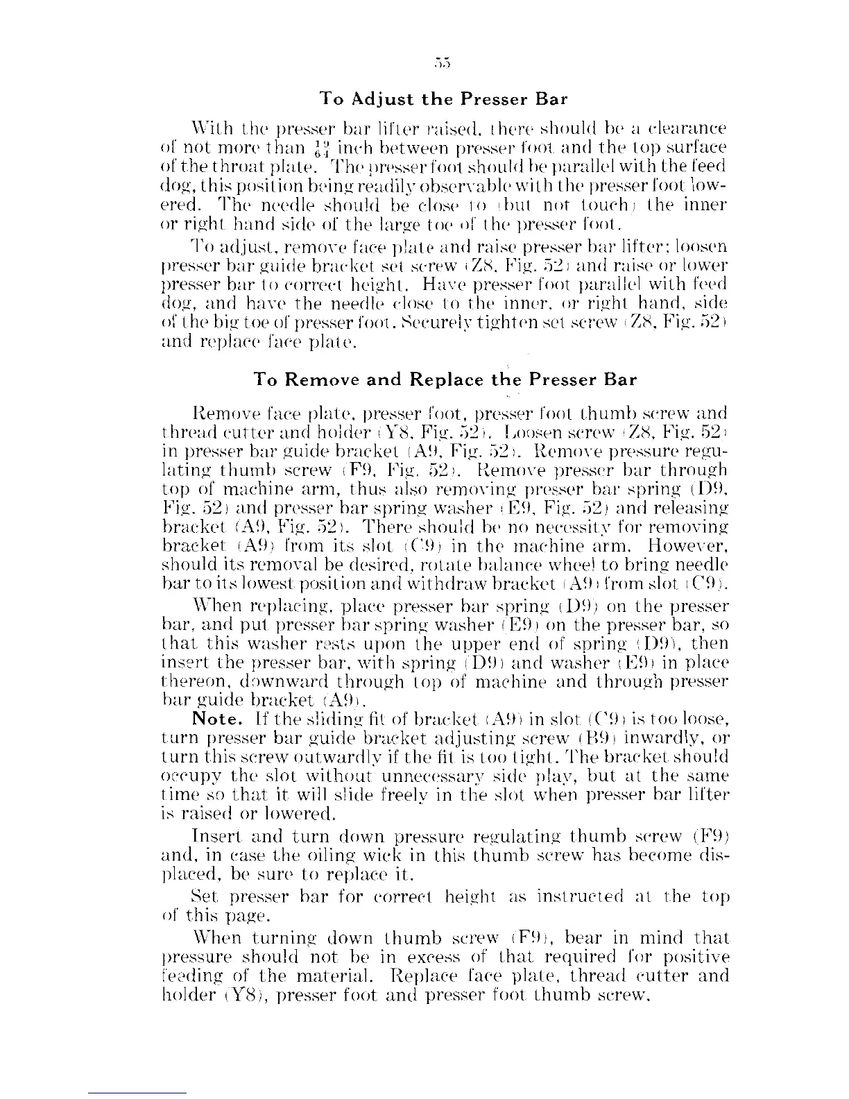 Singer 201-1 - To Adjust the Presser Bar; To Remove and Replace the Presser Bar