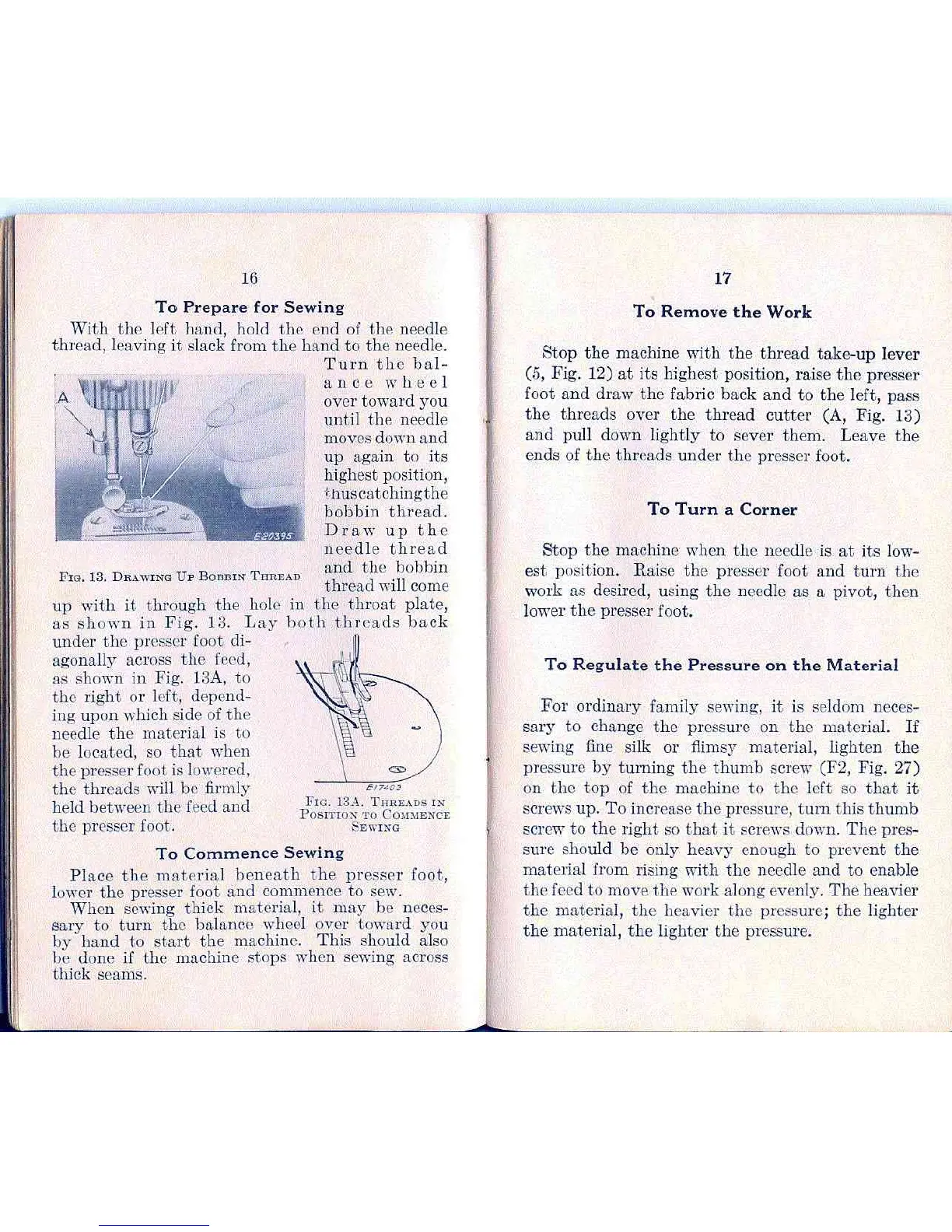 Singer 201-2 - To Prepare for Sewing; To Remove the Work; To Turn a Corner; To Regulate the Pressure on the Material