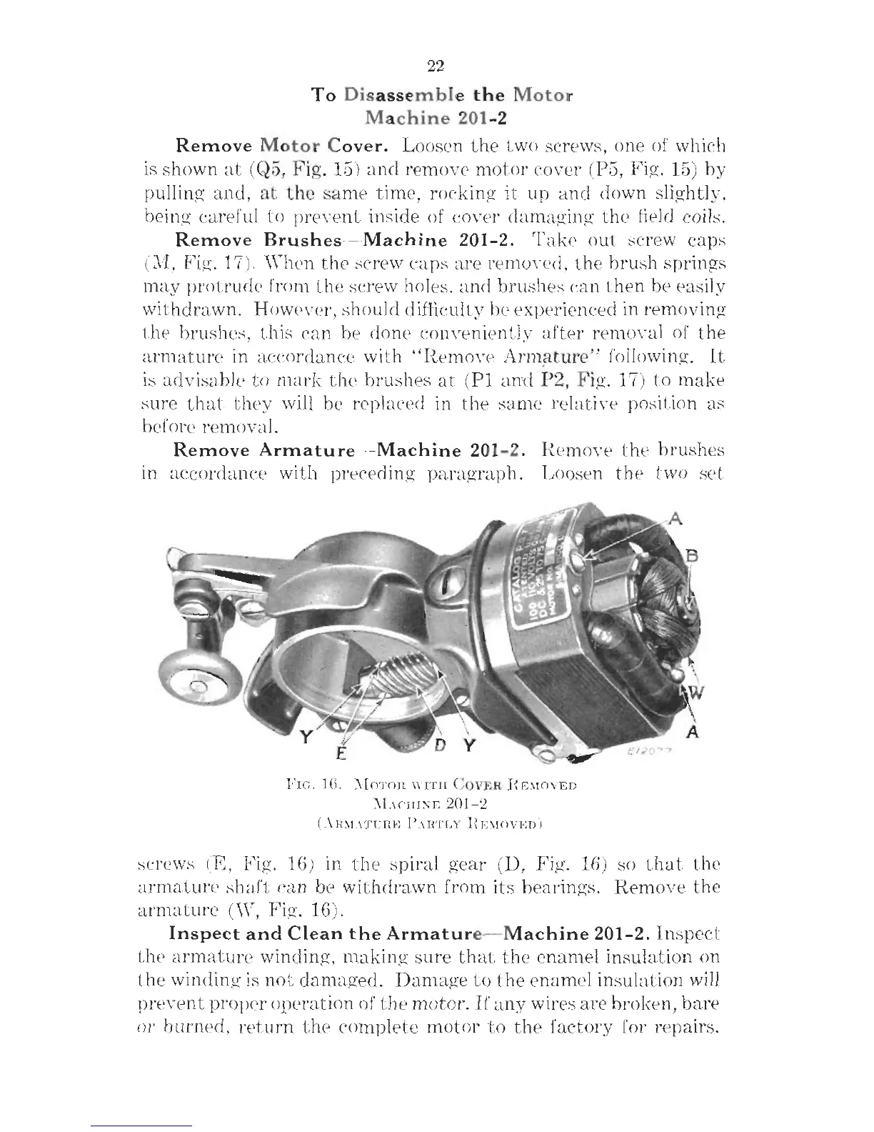 Singer 201-3 - Motor Disassembly Steps (Machine 201-2); Motor Cover and Brush Removal Steps
