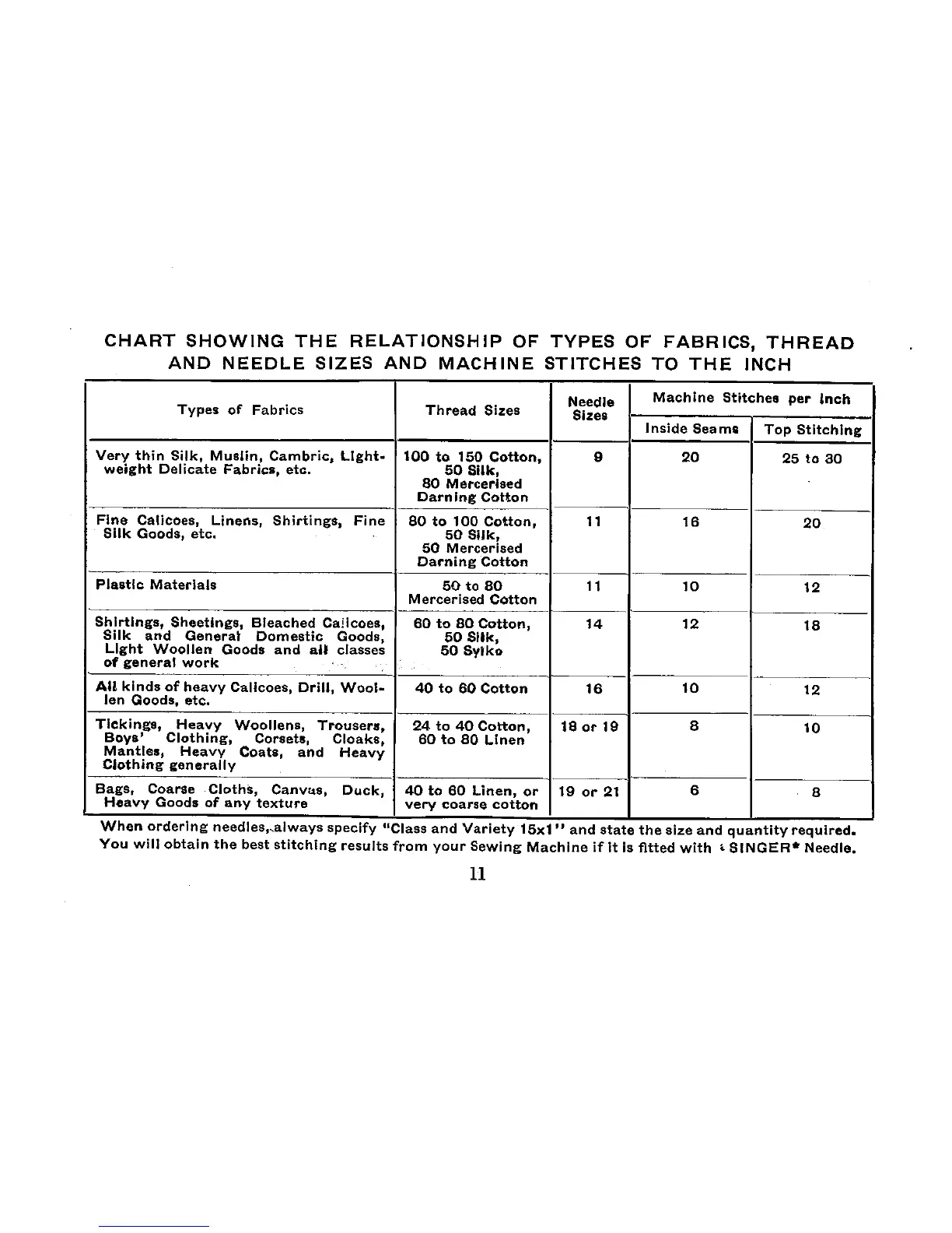 Singer 201K - Chart Showing the Relationship of Types of Fabrics, Thread and Needle Sizes and Machine Stitches to the Inch