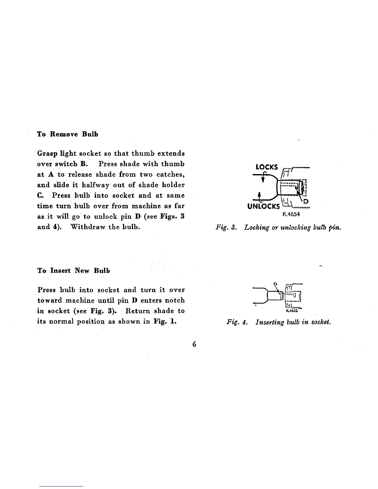 Singer 201K - To Remove Bulb; Locking or Unlocking Bulb Pin; To Insert New Bulb; Inserting Bulb in Socket