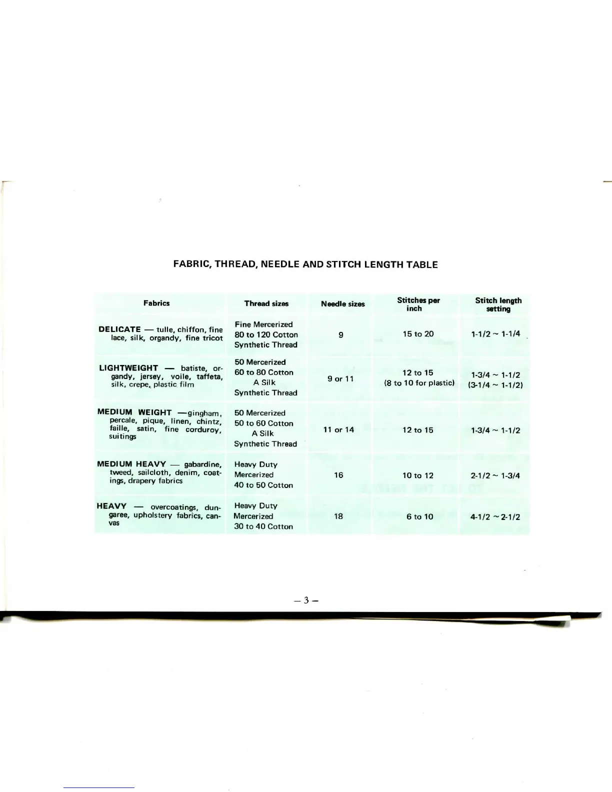 Singer 20U - Fabric, Thread, Needle and Stitch Length Table