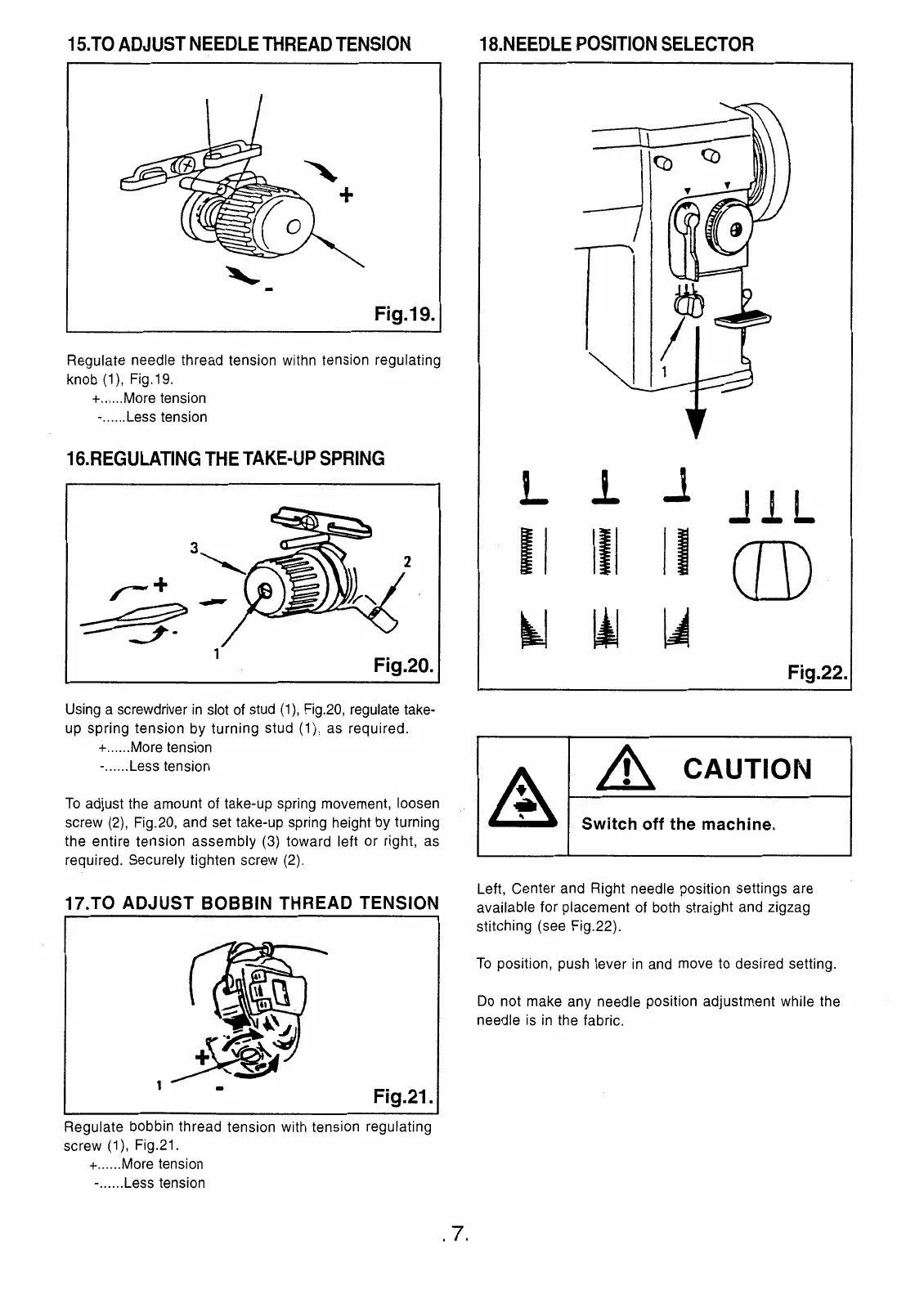 Singer 20U73 - To Adjust Needle Thread Tension; Regulating the Take-Up Spring; To Adjust Bobbin Thread Tension; Needle Position Selector