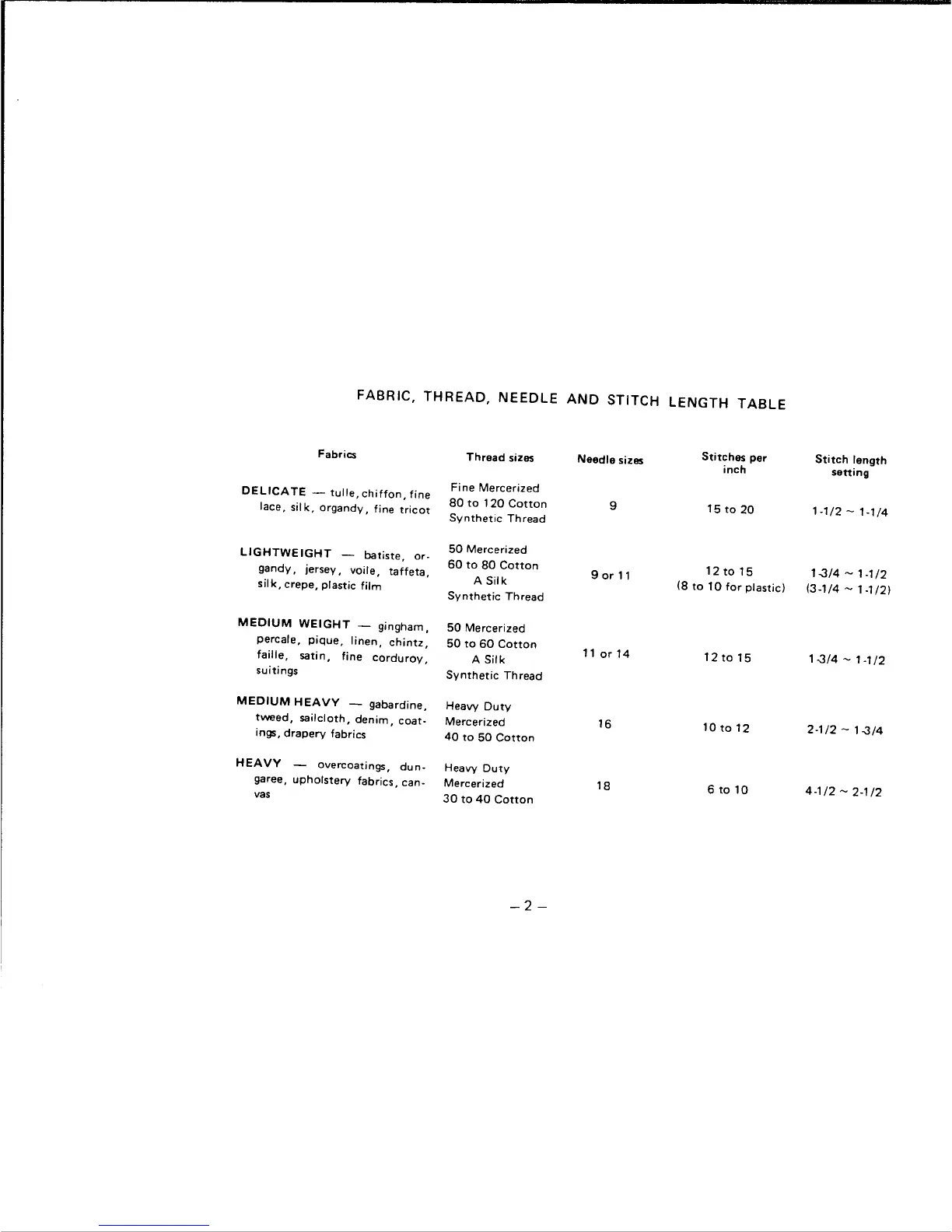 Singer 20UX143 - Fabric, Thread, Needle and Stitch Length Table