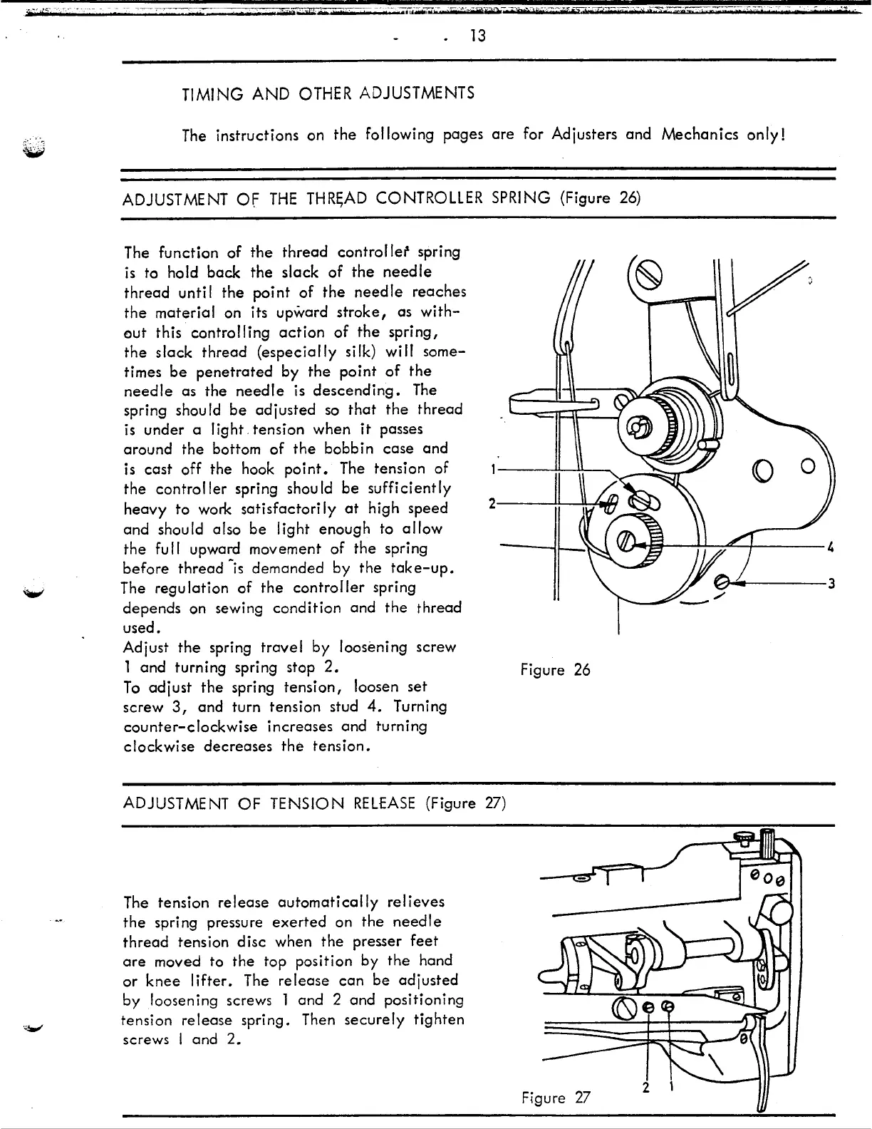Singer 211G165 - Timing and Adjustment Procedures; Thread Controller Spring Adjustment; Tension Release Adjustment