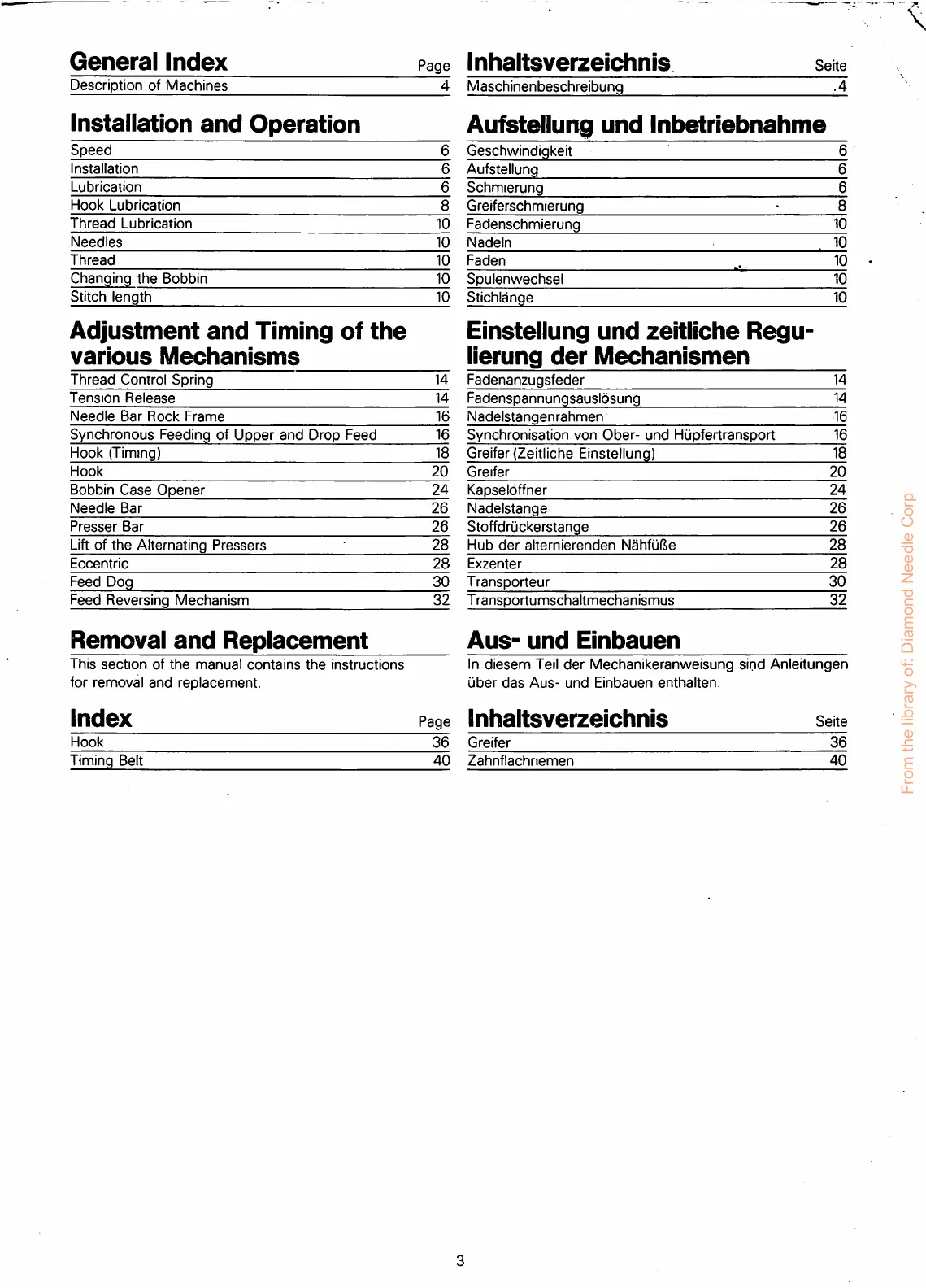 Singer 211G466 - Installation and Operation Aufstellung und Inbetriebnahme; Table of Contents