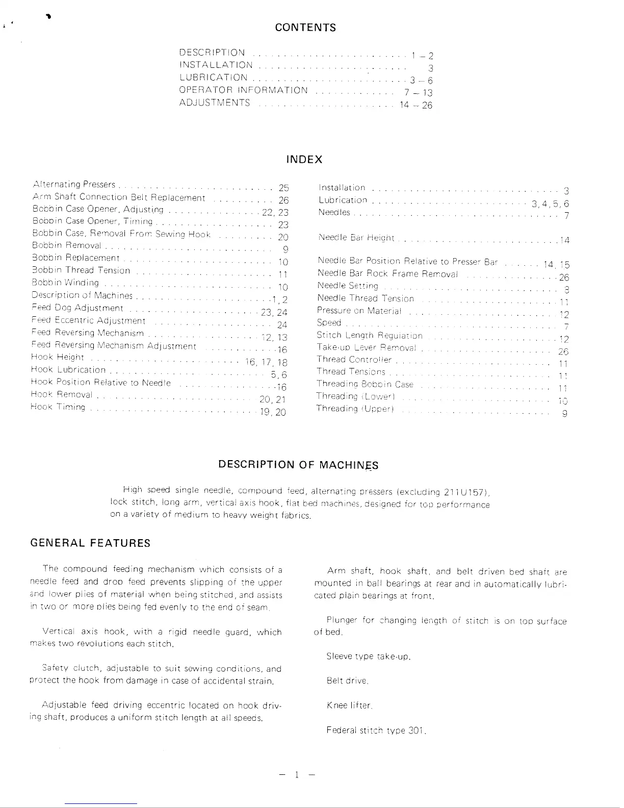 Singer 211U166A - DESCRIPTION OF MACHINES; GENERAL FEATURES