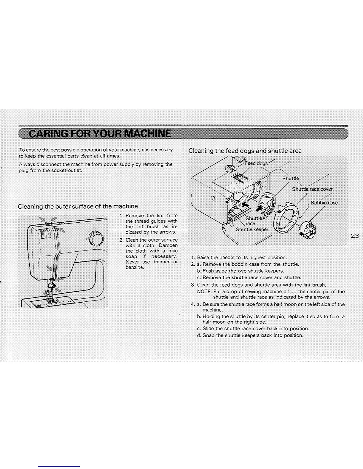 Singer 212 - CARING FOR YOUR MACHINE; Cleaning the outer surface of the machine; Cleaning the feed dogs and shuttle area
